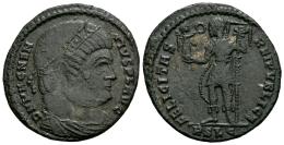 Magnencio. Centenional. 351-353 d.C. Lugdunum. (Ric-VIII 112). (Tesorillo-Magnencio 2, mismo ejemplar). Anv.: D N MAGNENTIVS P F AVG. Busto a la derecha, con diadema de rosetas, drapeado y con coraza. Rev.: FELICITAS REIPVBLICE. Emperador con uniforme militar, en pie a la izquierda, portando Victoria sobre un globo y un estandarte con crismón; RSLG en exergo. Ae. 4,66 g. Escasa. MBC. Est...60,00.
