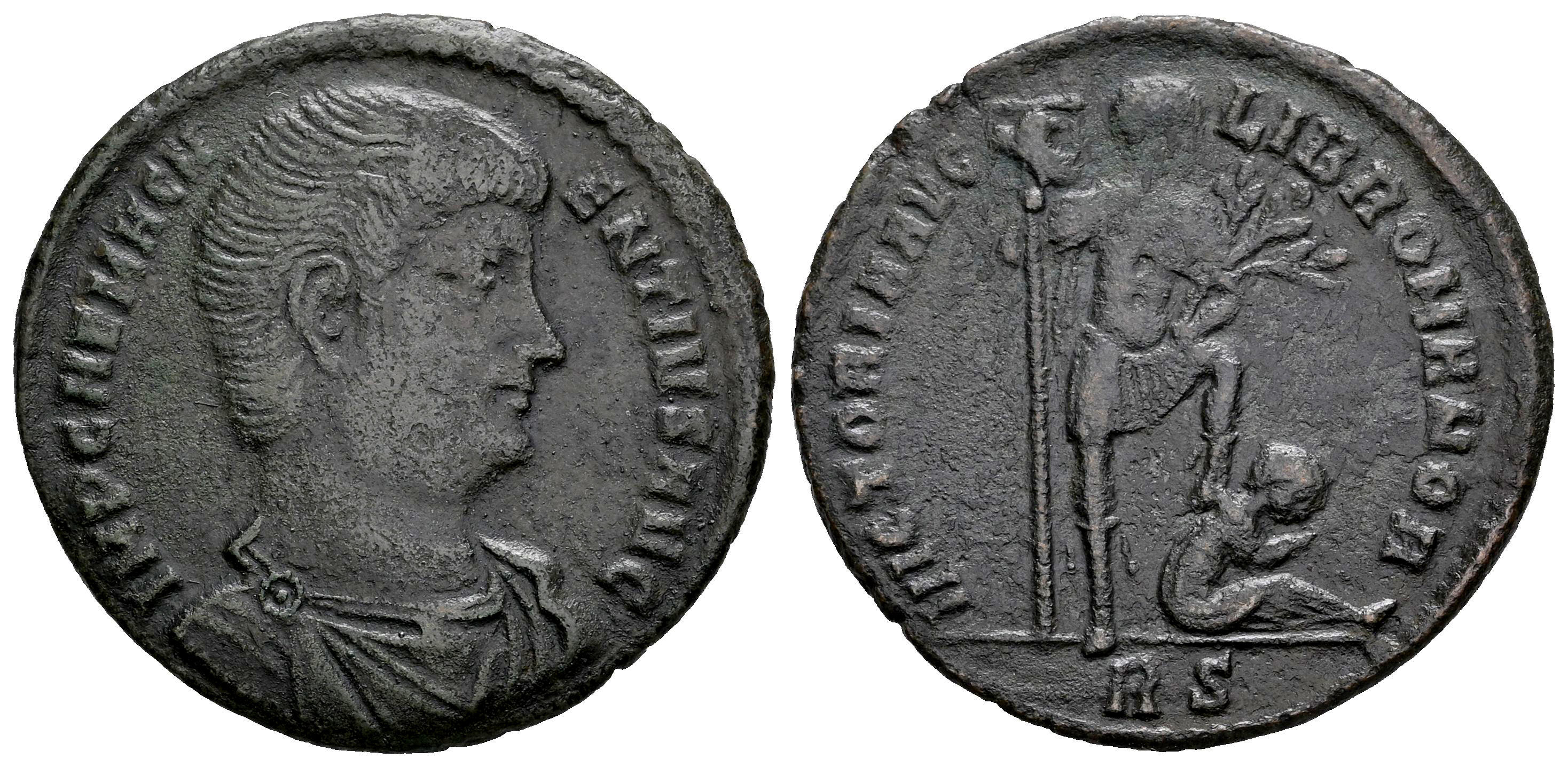 Magnencio. Centenional. 350 d.C. Roma. (Ric-VIII 177). (Bastien-394). (Tesorillo-Magnencio 19, mismo ejemplar). Anv.: IMP CAE MAGNENTIVS AVG. Busto con la cabeza descubierta, drapeado y con coraza a la derecha. Rev.: VICTORIA AVG LIB ROMANOR. Magnencio en pie a la derecha, con el pie sobre un cautivo atado a la derecha, sosteniendo vexillum y rama; RS en exergo . Ae. 4,43 g. Rara. Ex Artemide Aste (Octubre 2013), lote 740. Conserva la etiqueta original. MBC-. Est...80,00.