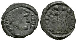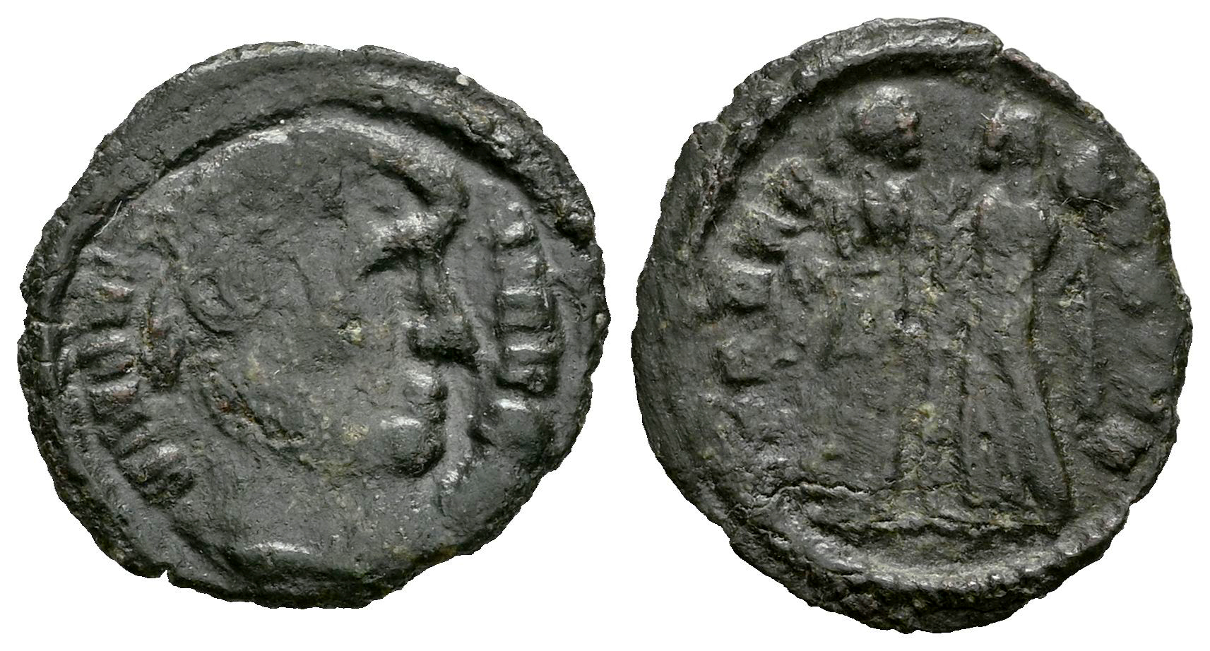 Magnencio. 1/2 centenional. 353 d.C. Imitación Bárbara. (Tesorillo-Magnencio 21, mismo ejemplar). Anv.: Leyenda de dificil lectura. Cabeza con diadema a la derecha. Rev.: Leyenda de dificil lectura. Dos victorias en pie, una frente a otra y ambas sosteniendo una palma. Ae. 0,98 g. Ex Gert Boersema, Vcoins (Julio 2012). BC+/MBC-. Est...40,00.