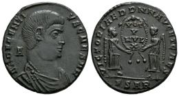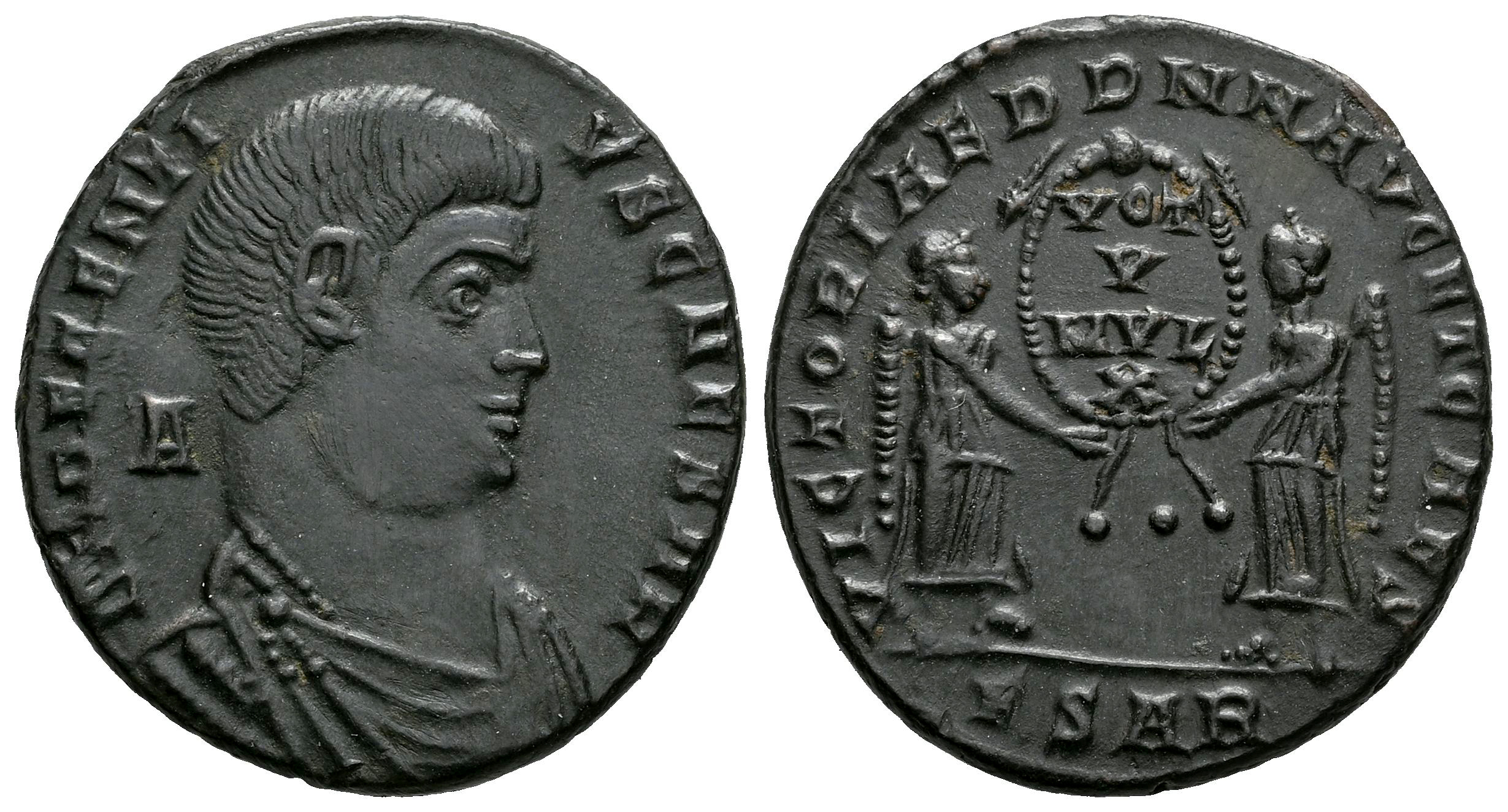 Decencio. Centenional. 351-353 d.C. Arelate. (Ric-VIII 168). (Tesorillo-Decencio 6, mismo ejemplar). Anv.:  D N DECENTIVS CAESAR. Busto con la cabeza desnuda, vestido y con coraza a la derecha; A detrás. Rev.: VICTORIAE DD NN AVG ET CAES. Dos Victorias sosteniendo una corona con la inscripción VOT V MVL X en cuatro líneas; FSAR en el exergo. Ae. 5,08 g. Buen ejemplar. EBC. Est...90,00.