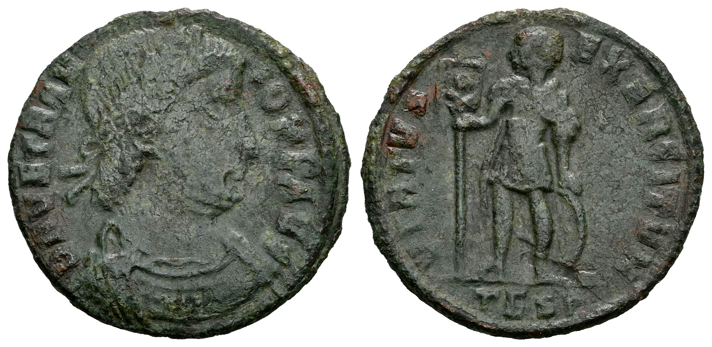 Vetranio. Follis. 350 d.C. Thessalonica. (Ric-VIII 138). (Tesorillo-Vetranio 4, mismo ejemplar). Anv.: D N VETRANIO P F AVG. Busto laureado, drapeado y con coraza hacia la derecha. Rev.: VIRTVS EXERCITVM. Emperador en pie de frente, sosteniendo labarum decorado con crismón y apoyando la mano sobre un escudo; TESΓ en el exergo. Ae. 2,51 g. MBC-/MBC. Est...80,00.