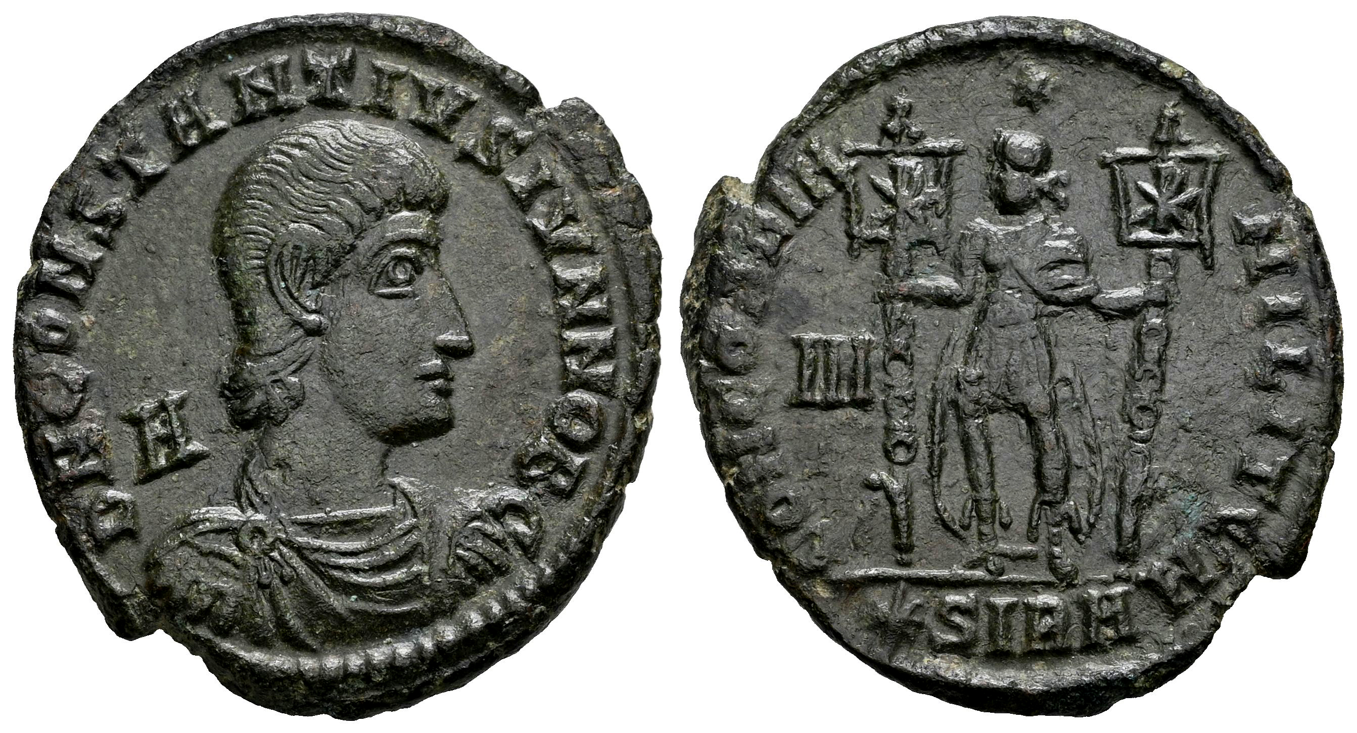 Constancio Galo. Maiorina. 351-3555 d.C. Sirmium. (Ric-VIII 22). (Tesorillo-Constancio Galo 2, mismo ejemplar). Anv.: D N CONSTANTIVS P F AVG. Busto con diadema de perlas, drapeado y coraza a derecha; en el campo izquierdo A. Rev.: CONCORDIA MILITVM. Constancio II en pie a izquierda, portando dos Signum con crismón en los estandartes; III en el campo izquierdo, ✱SIRM en exergo. Ae. 5,76 g. Ex Roman Lode, Vcoins (Marzo 2007). MBC+/MBC. Est...80,00.