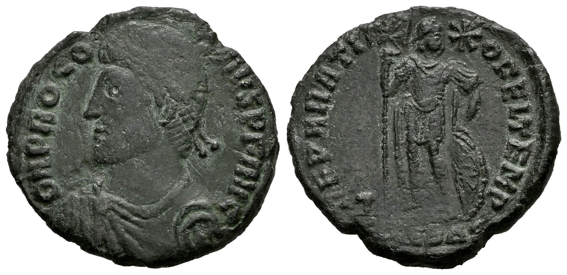 Procopio. Follis. 365-366 d.C. Constantinopla. (Ric-IX 17a). (Tesorillo-Procopio 2, mismo ejemplar). Anv.: D N PROCOPIVS P F AVG. Busto con diadema de perlas, drapeado y coraza a la izquierda. Rev.: REPARATIO FEL TEMP. Emperador en pie de frente, sosteniendo labarum y apoyando la mano sobre un escudo, pequeño objeto indeterminado a la izquierda, cristograma en el campo superior derecho; CONSA en el exergo. Ae. 3,29 g. Campos ligeramente alisados. Ex Colección Warren Esty (Agosto 2006). MBC. Est...70,00.