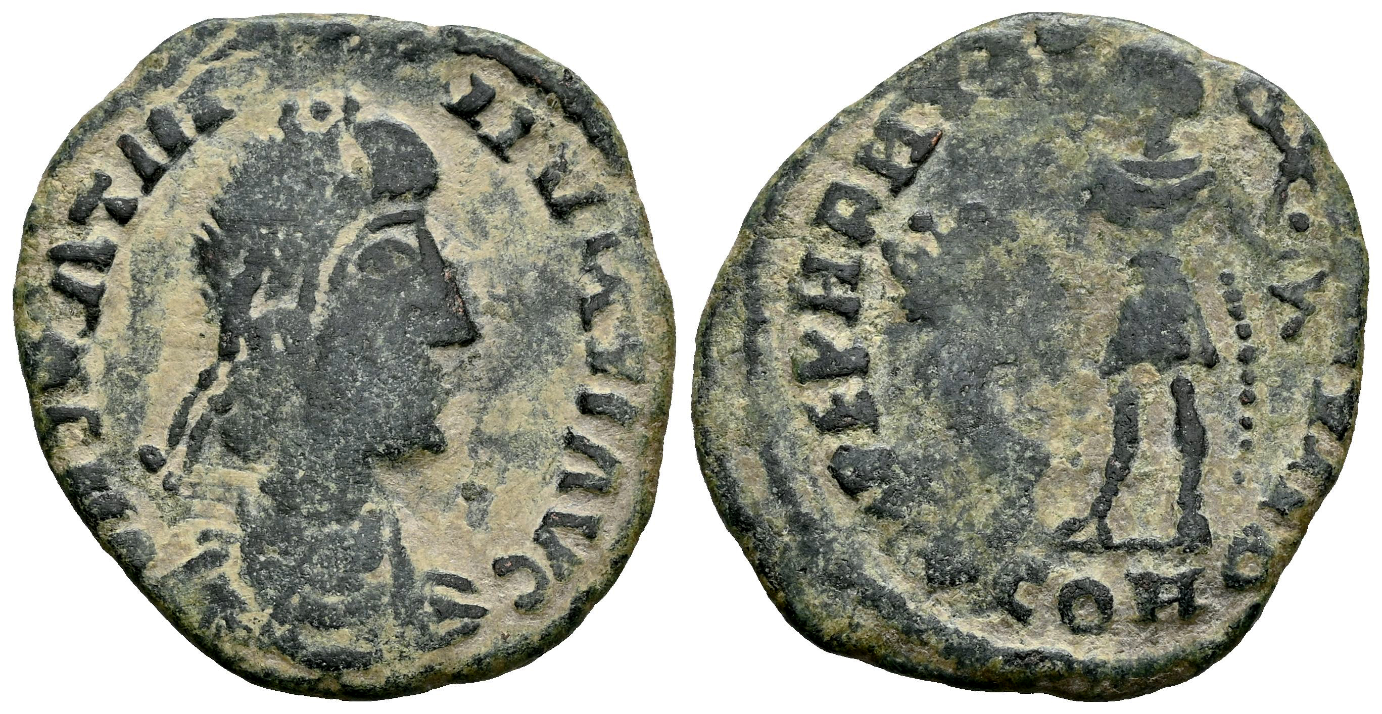 Graciano. Maiorina. 378-383 d.C. Arles. (Ric-Tipo IX 20a). (Tesorillo-Graciano 14, mismo ejemplar). Anv.: DN GRATIANVS PF AVG, Busto con diadema de perlas, drapeado y con coraza a la izquierda. Rev.: REPARATIO REIPVB, Graciano en pie de frente, mirando a la izquierda, portando Victoria sobre globo y alzando a mujer arrodillada a la izquierda; PCON en exergo. Ae. 4,95 g. Imitación bárbara. MBC-. Est...30,00.