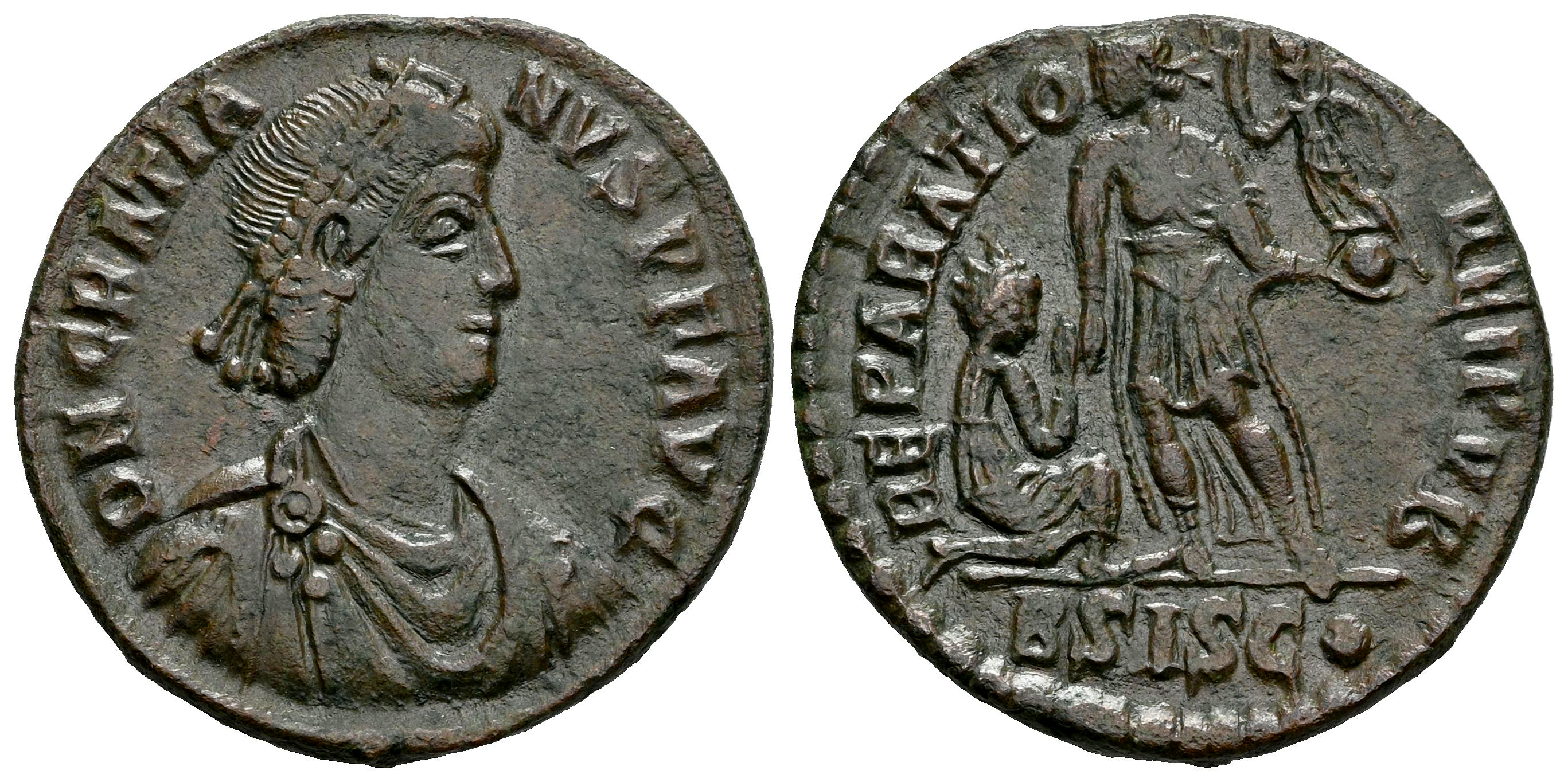 Graciano. Maiorina. 378-383 d.C. Siscia. (Ric-IX 26a). (Tesorillo-Graciano 11, mismo ejemplar). Anv.: D N GRATIANVS P F AVG, Busto con diadema de perlas, drapeado y con coraza a la derecha. Rev.: REPARATIO REIPVB, Emperador en pie de frente, mirando a la izquierda, levandando a una mujer arrodillada y portando victoria sobre globo; BSISC• en exergo. Ae. 5,06 g. MBC+. Est...50,00.