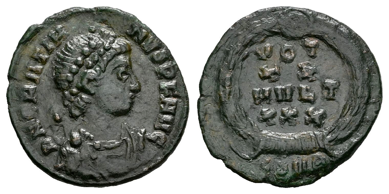 Graciano. Nummus. 378-383 d.C. Heraclea. (Ric-IX 196 20a). (C-77). (Tesorillo-Graciano 23, mismo ejemplar). Anv.: DN GRATIA NVS PF AVG, Busto con diadema de perlas, drapeado y con coraza a la derecha. Rev.: VOT / XX / MVLT / XXX, Dentro de una corona de laurel, atada por un medallón en la parte superior y con cintas en la parte inferior; SMHB en exergo. Ae. 0,84 g. Ex Roman Lode, Vcoins (Febrero 2008). MBC+. Est...50,00.