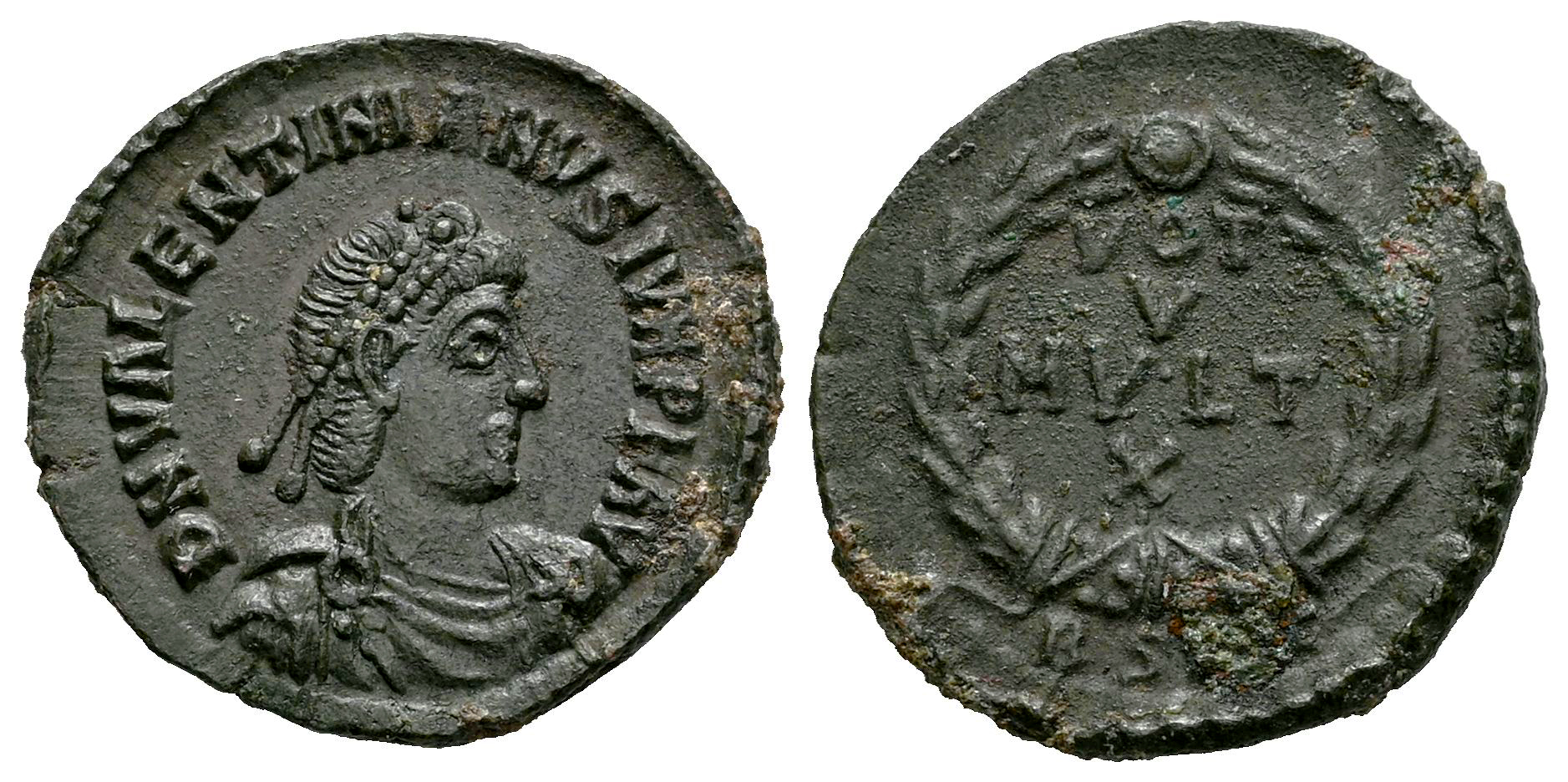 Valentiniano II. Nummus. 378-383 d.C. Siscia. (Ric-IX 29c). (Tesorillo-Valentiniano II 15, mismo ejemplar). Anv.: D N VALENTINIANVS IVN PF AVG. Busto con diadema de perlas, drapeado y con coraza a la derecha. Rev.: VOT / V / MVLT / X en cuatro líneas dentro de corona; SISC en exergo. Ae. 1,54 g. EBC/MBC+. Est...50,00.