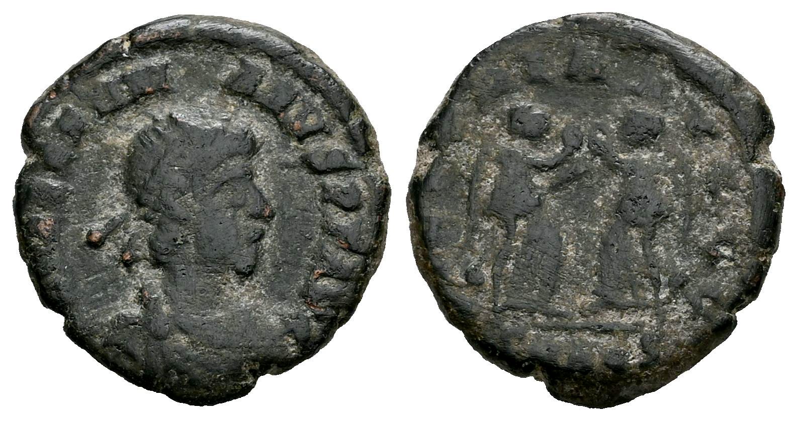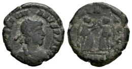 Valentiniano II. Nummus. 367-375 d.C. Aquileia. (Ric-IX 47a). (Tesorillo-Valentiniano II 12, mismo ejemplar). Anv.: D N VALENTINIANVS P F AVG, Busto con diadema de perlas, drapeado y con coraza a la derecha. Rev.: VICTORIA AVGGG. Dos victorias una frente a otra portando coronas en sus manos; SMAQS en exergo. Ae. 1,35 g. MBC. Est...30,00.