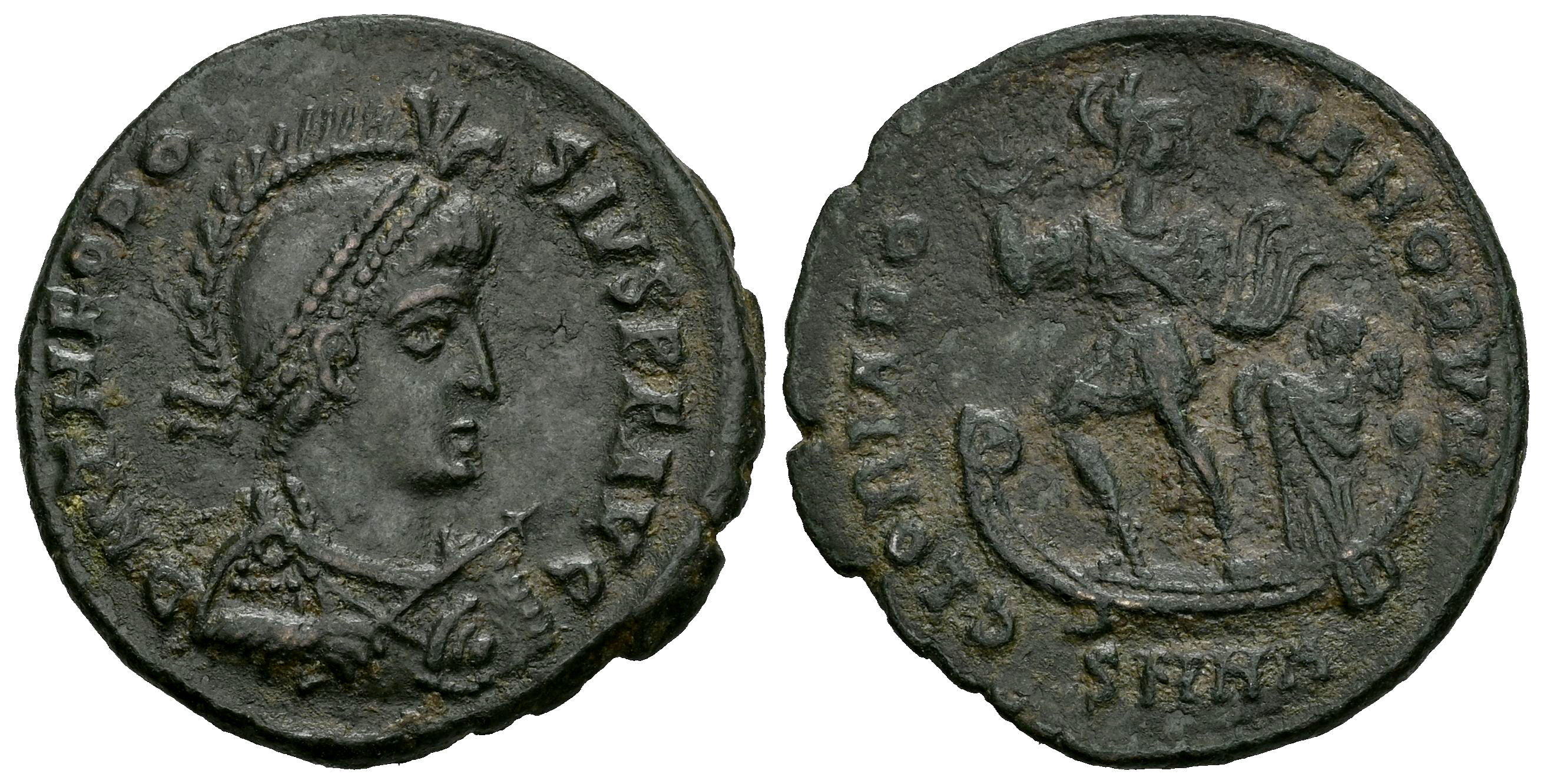 Theodosio I. Maiorina. 379-395 d.C. Heraclea. (Ric-IX 11c). (Tesorillo-Theodosio I 6, mismo ejemplar). Anv.: D N THEODOSIVS P F AVG. Busto a la derecha, con diadema de perlas, casco, drapeado y coraza, portando lanza y escudo. Rev.: GLORIA ROMANORVM. Teodosio en pie a la izquierda sobre galera, mirando a la derecha, mano alzada; Victoria sedente a la derecha; SMHA en exergo. Ae. 4,28 g. Ex Roman Lode, Vcoins (Junio 2007). MBC+/MBC. Est...50,00.