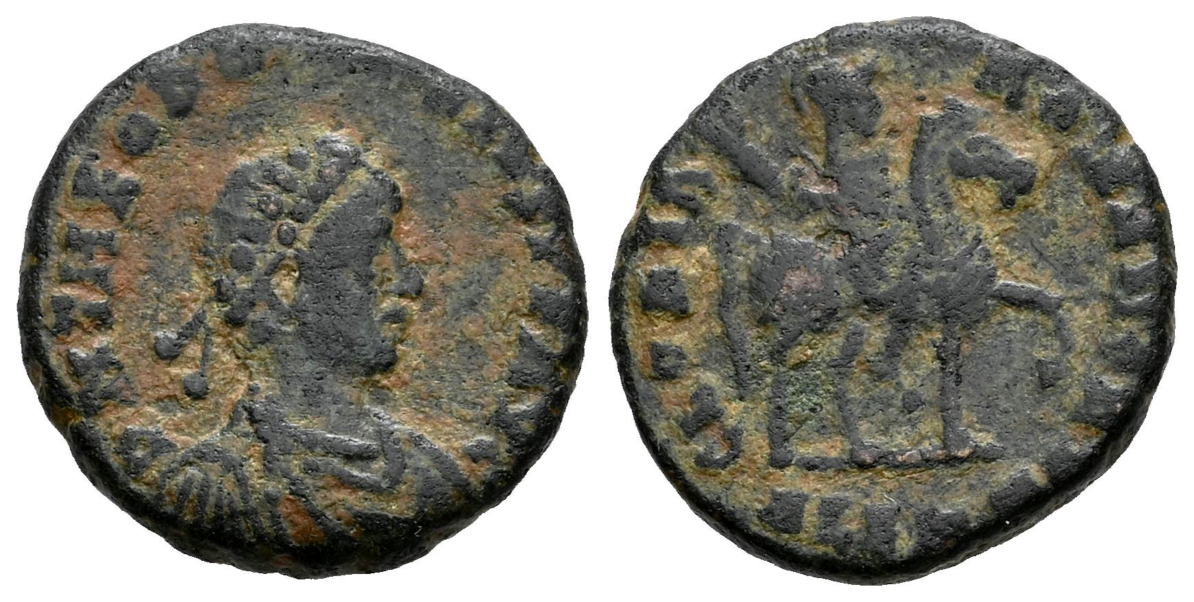 Theodosio I. 1/2 centenional. 392-395 d.C. (Ric-IX 22a). (C-21). (Tesorillo-Teodosio I 10, mismo ejemplar). Anv.: D N THEODOSIVS P F AVG, Busto con diadema de perlas, drapeado y con coraza a la derecha. Rev.: GLORIA ROMANORVM, Emperadro a caballo a la derecha, con el brazo extendido; ALEΓ en exergo. Ae. 2,34 g. Rara. Ex V. Craven, Convención de Madrid (Abril 2006). MBC. Est...50,00.