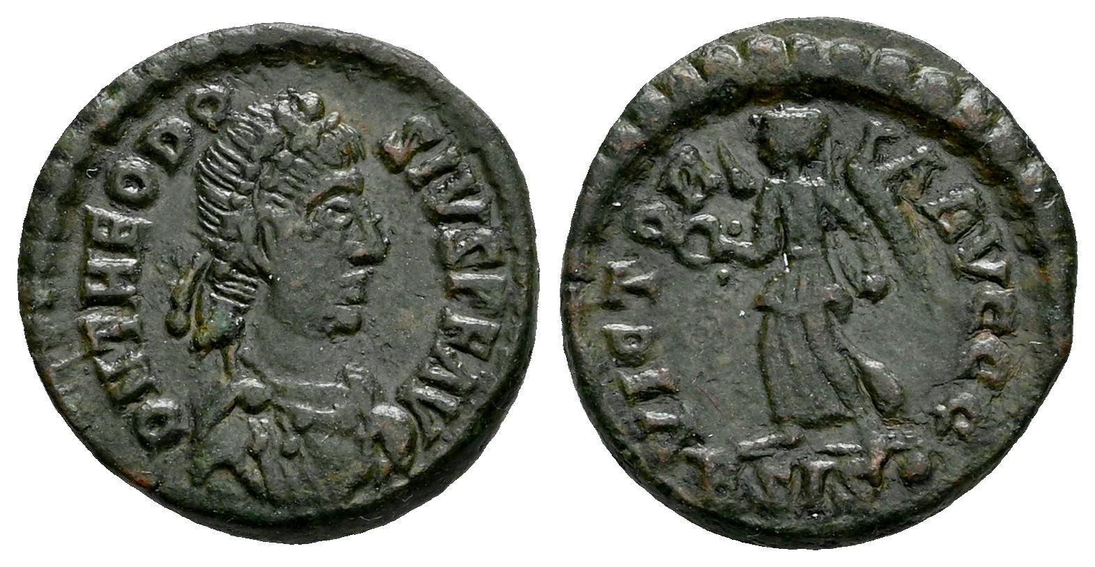 Theodosio I. 1/2 centenional. 384-387 d.C. Siscia. (Ric-IX 39b.4). (LRBC-1576). (Tesorillo-Theodosio I 18, mismo ejemplar). Anv.: D N THEODOSIVS P F AVG. Busto con diadema de perlas, drapeado y coraza hacia la derecha. Rev.: VICTORIA AVGGG. Victoria avanzando hacia la izquierda, sosteniendo corona y hoja de palma; BSIS. Ae. 1,36 g. Ex Rutten & Weiland, Vcoins (Noviembre 2006). EBC-/MBC+. Est...50,00.