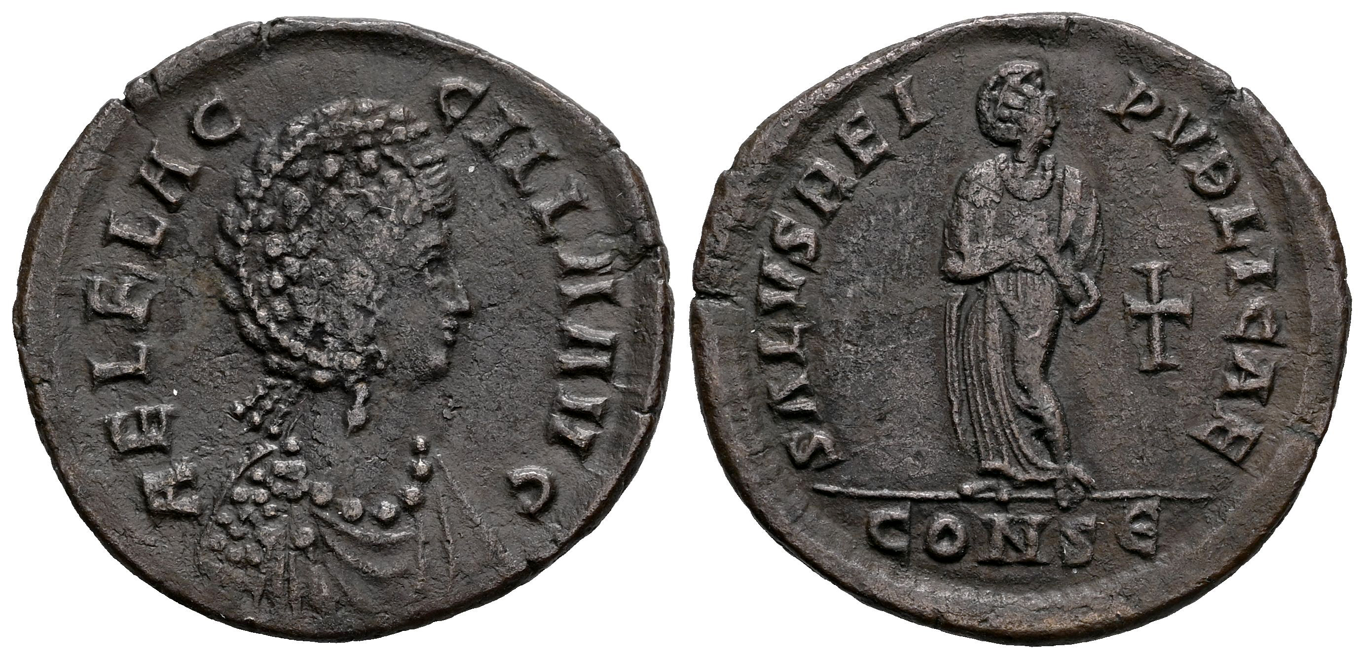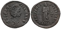 Aelia Flacilla. Maiorina. 383-386 d.C. Constantinopla. (Ric-IX 82.3). (LRBC-2181). (Tesorillo-A. Flacilla 3, mismo ejemplar). Anv.: AEL FLACILLA AVG. Busto drapeado a la derecha, con un elaborado tocado. Rev.: SALVS REI PVBLICAE. Emperatriz en pie de frente, mirando a la derecha, brazos cruzados sobre el pecho; Crismón en el campo derecho, CONSЄ en exergo. Ae. 4,10 g. MBC+. Est...80,00.