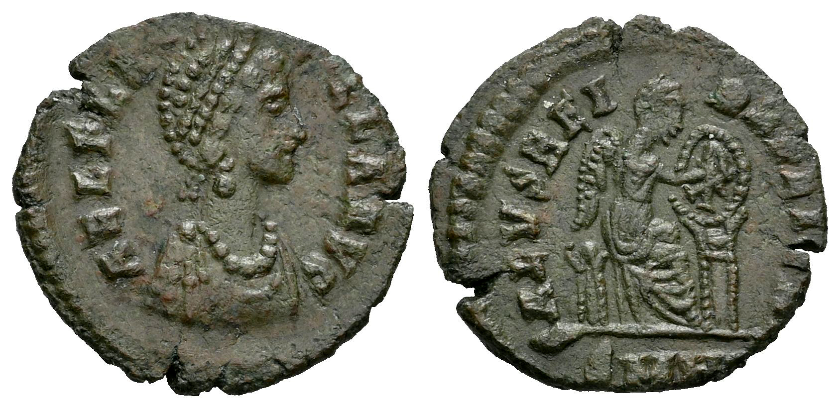 Aelia Flacilla. Centenional. 378-383 d.C. Nicomedia. (Ric-IX 36 var.). (Tesorillo-A. Flacilla 4, mismo ejemplar). Anv.: AEL FLACILLA AVG. Busto diademado y drapeado a la derecha. Rev.: SALVS REIPVBLICAE. Victoria sedente a la derecha, dibujando cristograma en el escudo; SMN¿A? en el exergo. Ae. 0,84 g. MBC+. Est...60,00.