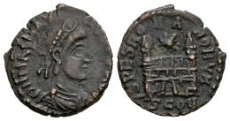 Magno Máximo. Nummus. 387-388 d.C. Arelate. (Ric-IX 29a). (LRBC-560). (Tesorillo-Magno Máximo 9, mismo ejemplar). Anv.: D N MAG MAXIMVS P F AVG, Busto con diadema de perlas, drapeado y con coraza a la derecha. Rev.: SPES ROMANORVM. Puerta de campamento sin puertas, dos almenas, estrella arriba; SCON en exergo. Ae. 1,22 g. Ex Ancient Imports, Vcoins (Junio 2007). MBC/MBC+. Est...60,00.