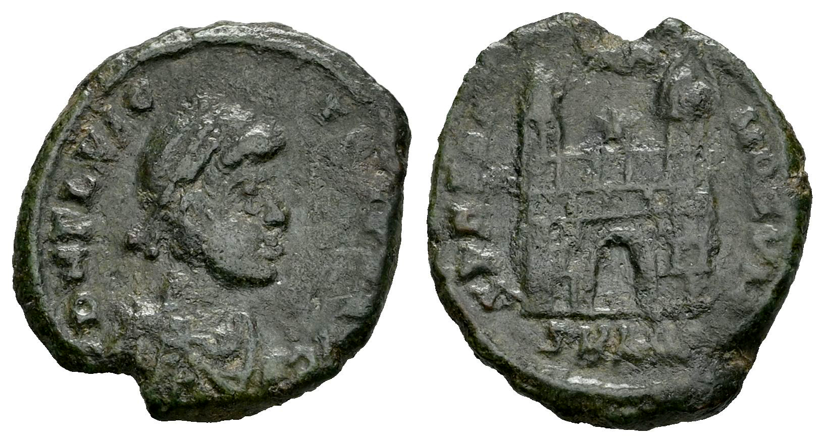 Flavio Victor. Nummus. 387-388 d.C. Aquileia. (Ric-IV 55b). (Tesorillo-Flavio Victor 1, mismo ejemplar). Anv.: D N FL VICTOR P F AVG. Busto con diadema de perlas, drapeado y coraza a la derecha. Rev.: SPES ROMANORVM. Puerta del campamento con dos torres, estrella arriba, sin puertas; SMAQ en exergo. Ae. 1,50 g. Ex Ancient Delights, actualmente Mayor 25. Convención de Madrid (Diciembre 2005). MBC. Est...60,00.