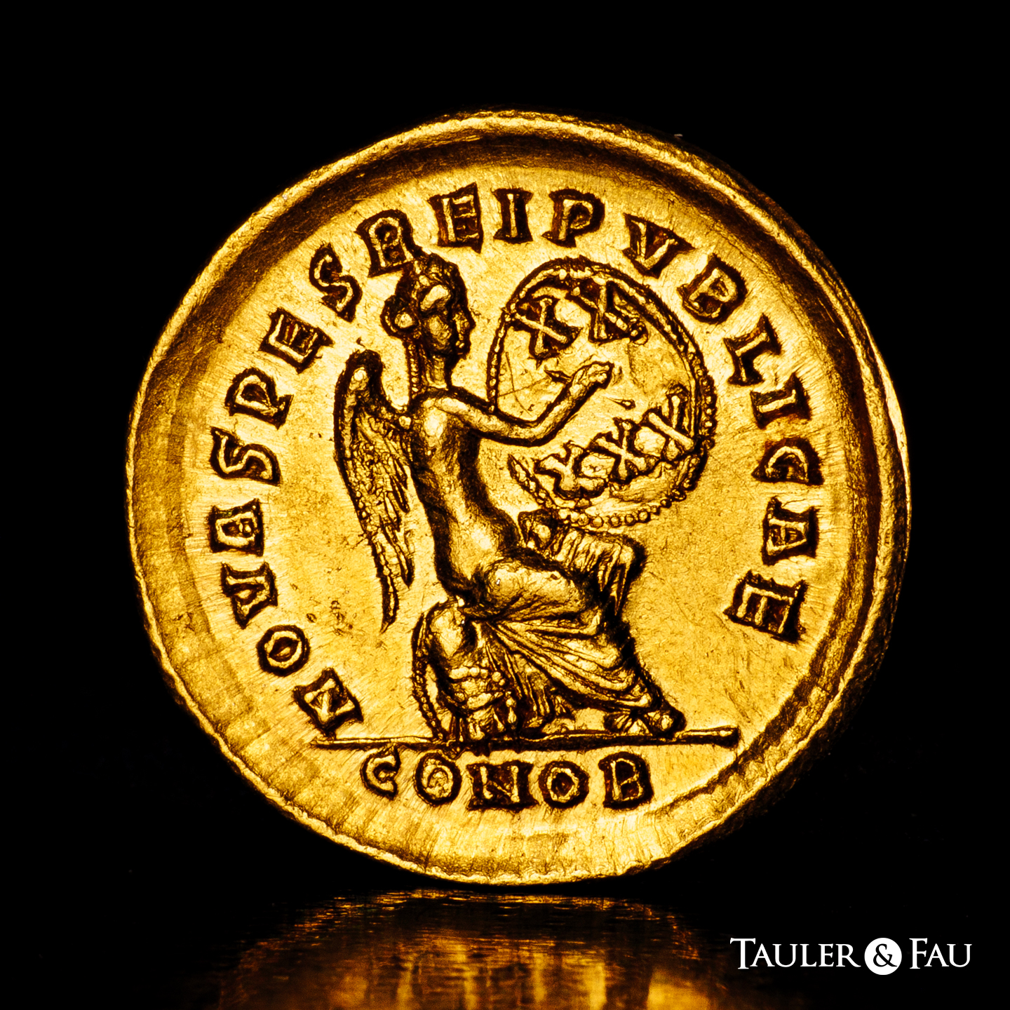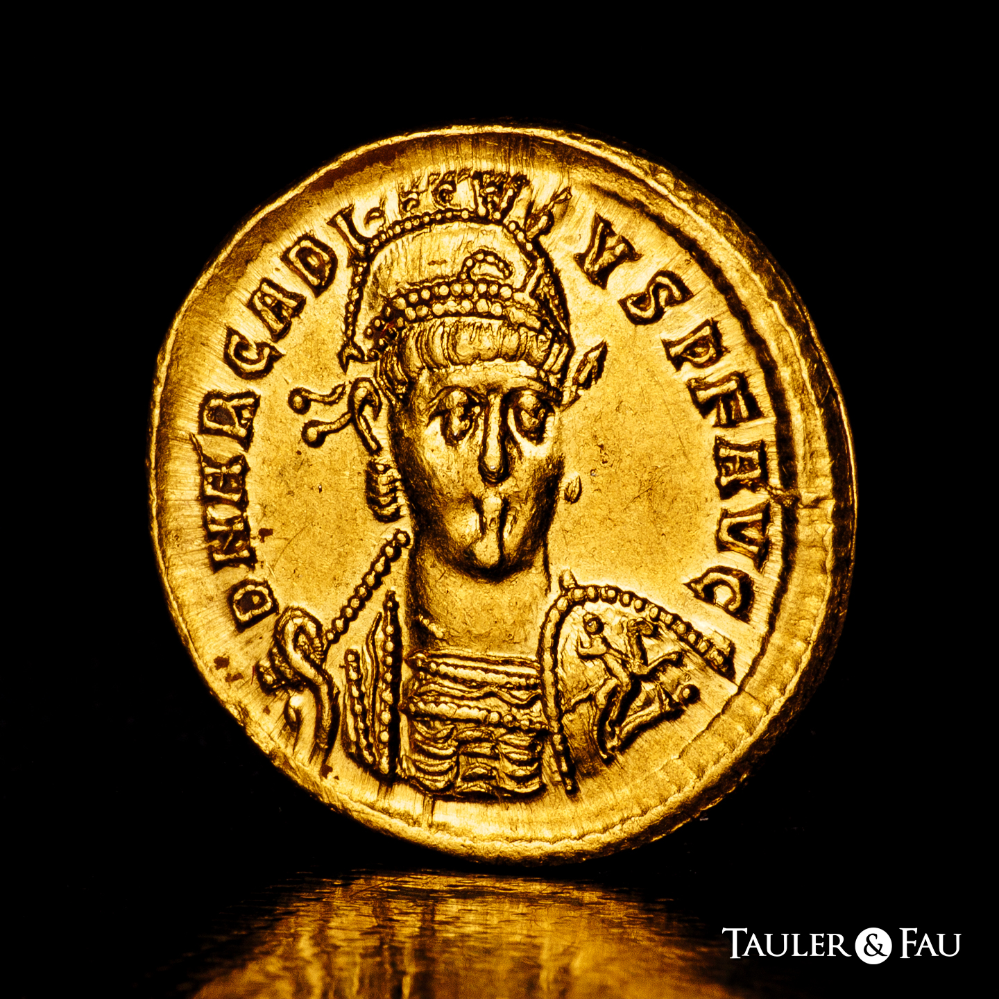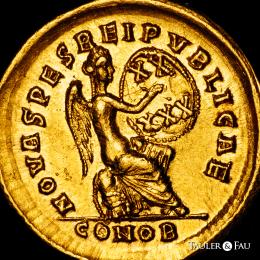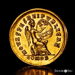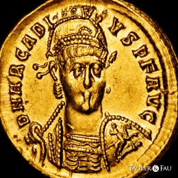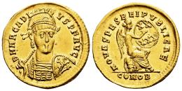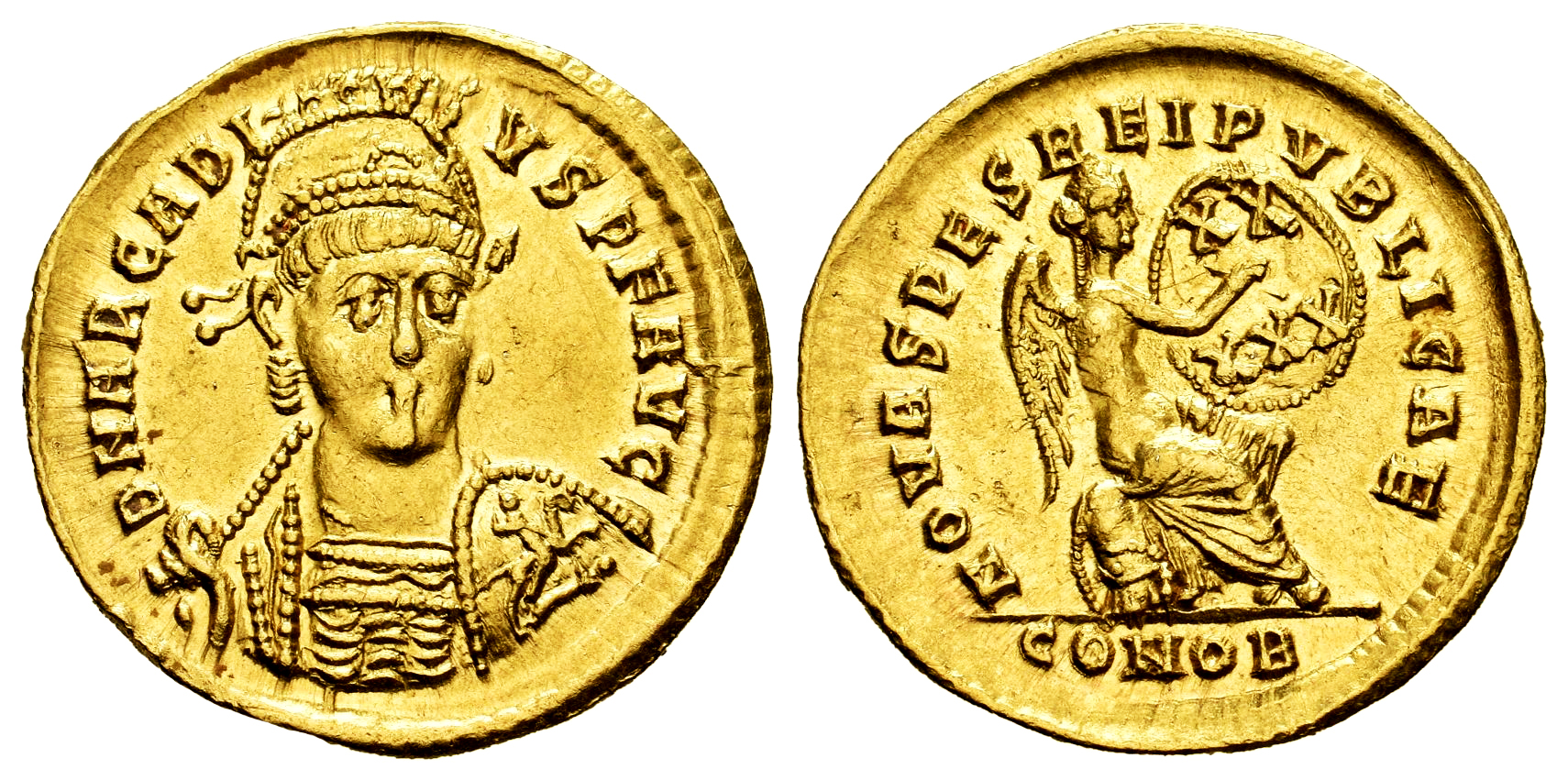 Arcadio. Sólido. 402-403 d.C. Constantinopla. (Ric-22). (Depeyrot-54/2). (Tesorillo-Arcadio 2, mismo ejemplar). Anv.: D N ARCADIVS P F AVG. Busto con diadema de perlas, casco y coraza, ligeramente inclinado hacia la derecha, con lanza en la mano derecha y escudo, decorado con un jinete atacando a un enemigo caído, sobre el hombro izquierdo. Rev.: NOVA SPES REI PVBLICAE. Victoria sedente a la derecha sobre coraza, escudo con inscripción XX/XXX sobre su rodilla izquierda; debajo coraza, escudo; CONOB en exergo. Au. 4,47 g. Restos de brillo original. Ínfimas rayitas. Muy bella. Ex J. Vico 123 (17/06/2010), lote 304. Conserva la etiqueta original. EBC-. Est...1200,00.