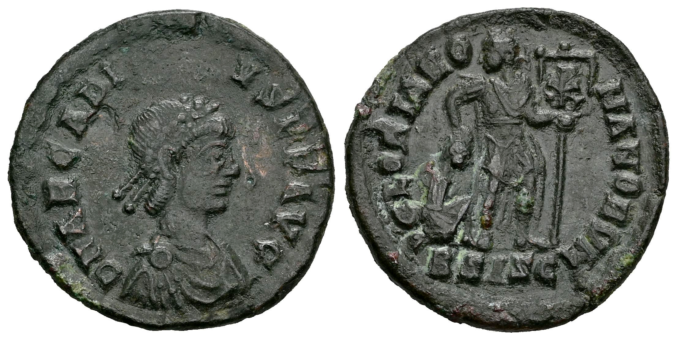 Arcadio. Centenional. 284-287 d.C. Siscia. (Ric-IX 38c). (Tesorillo-Arcadio 11, mismo ejemplar). Anv.: D N ARCADIVS P F AVG. Busto con diadema de perlas, drapeado y coraza a la derecha. Rev.: GLORIA ROMANORVM. Emperador sosteniendo labarum y arrastrando cautivo a la derecha; BSISC en exergo. Ae. 2,72 g. Ex Colección Warren Esty (Junio 2007). MBC. Est...30,00.