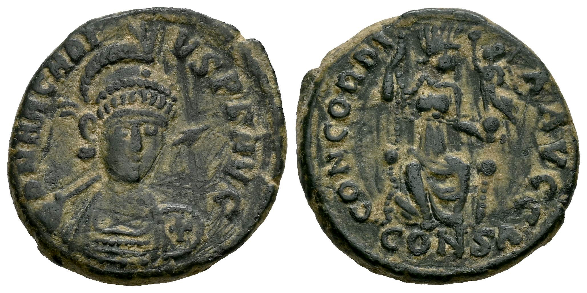 Arcadio. Centenional. 401-403 d.C. Constantinopla. (Ric-X 86). (Tesorillo-Arcadio 4, mismo ejemplar). Anv.: D N ARCADIVS P F AVG. Busto con diadema de perlas, casco y coraza, a la derecha, sosteniendo una lanza sobre su hombro derecho y escudo con una cruz. Rev.: CONCORDIA AVGG. Constantinopolis entronizada de frente, mirando hacia la izquierda, sosteniendo un cetro largo y una Victoria sobre un globo, apoyando un pie en la proa; CONSA en exergo. Ae. 3,52 g. Ex Ancient Delights, actualmente Mayor 25. Convención de Madrid (Diciembre 2007). MBC+. Est...50,00.