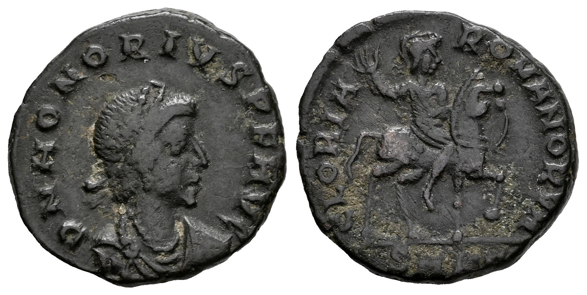 Honorio. 1/2 centenional. 393-423 d.C. Cyzicus. (Ric-29v). (Tesorillo-Honorio 9, mismo ejemplar). Anv.: D N HONORIVS P F AVG, Busto con diadema de perlas, drapeado y con coraza a la derecha. Rev.: GLORIA ROMANORVM, Emperador con la mano derecha levantada sobre caballo a la derecha; SMKA en exergo. Ae. 2,12 g. Ex J. Sermarini, Forum Ancient Coins 24510 (Septiembre 2007). Conserva la etiqueta original. MBC+. Est...45,00.
