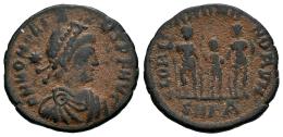 Honorio. 1/2 centenional. 406-408 d.C. Cyzicus. (Ric-X 149). (C-28). (Tesorillo-Honorio 10, mismo ejemplar). Anv.: D N HONORIVS P F AVG, Busto con diadema de perlas, drapeado y coraza a la derecha; estrella detrás. Rev.: GLORIA ROMANORVM, Arcadio, Honorio y Theodosio en pie de frente, cada uno con una lanza; SMKA en exergo. Ae. 1,77 g. Ex Vaughn Rare Coins Gallery, Vcoins (Mayo 2009). MBC/MBC-. Est...45,00.