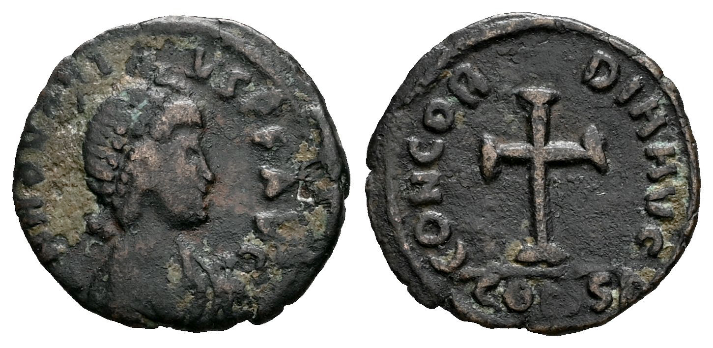 Honorio. Nummus. 393-423 d.C. Constantinopla. (Ric-X 109). (Tesorillo-Honorio 6, mismo ejemplar). Anv.: D N HONORIVS P F AVG. Busto con diadema de perlas, drapeado y con coraza a la derecha. Rev.: CONCORDIA AVG. Cruz; CONSA en exergo. Ae. 0,65 g. Ex David Connors, Vcoins (Mayo 2007). MBC/MBC+. Est...50,00.