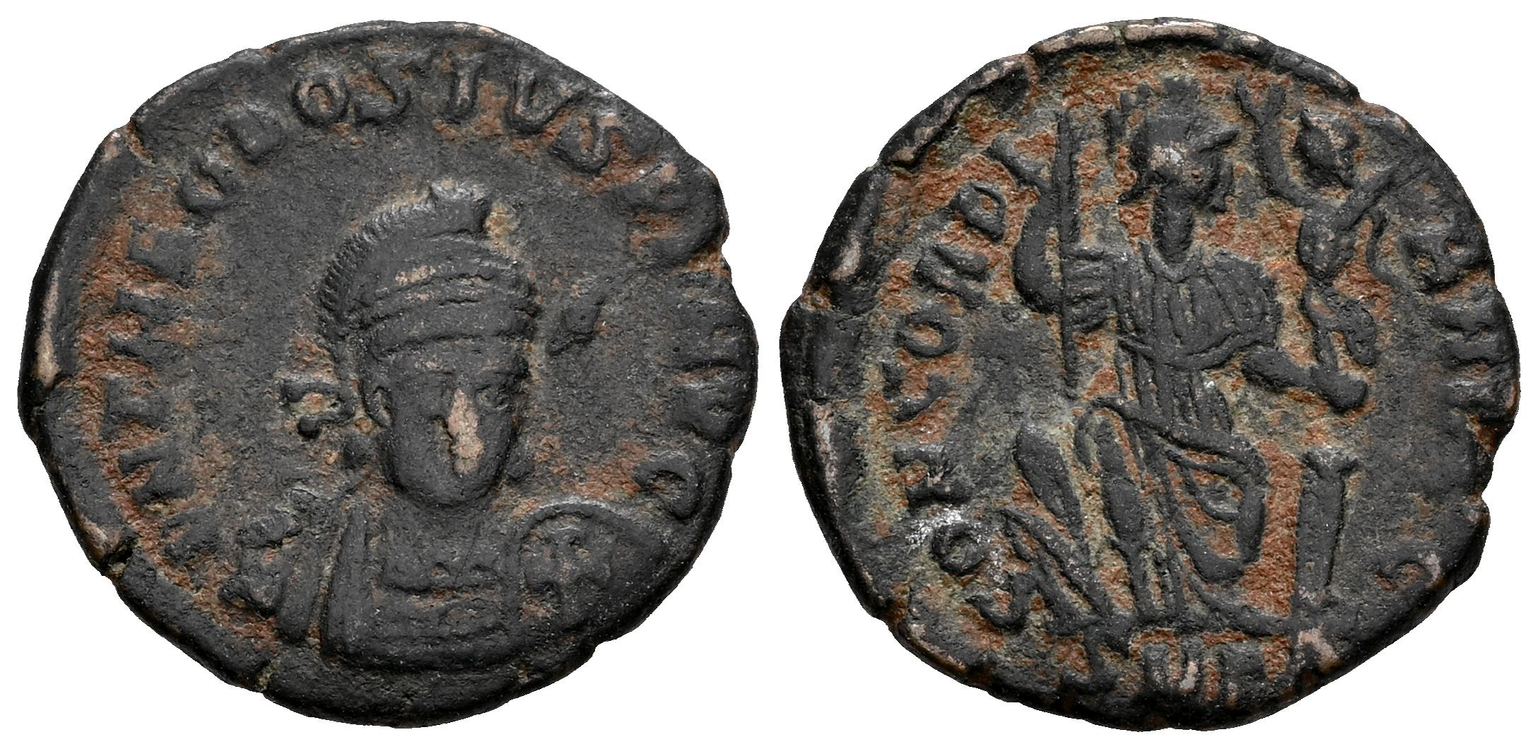Theodosio II. Centenional. 402-403 d.C. Cyzicus. (Ric-X 96). (LRBC-2588). (Tesorillo-Theodosio II 5, mismo ejemplar). Anv.: D N THEODOSIVS P F AVG. Busto con casco y coraza, ligeramente de frente y murando a la derecha, con lanza sobre el hombro y sosteniendo escudo. Rev.: CONCORDIA AVGG. Constantinopolis, con casco, drapeado, entronizado, de frente, mirando a la derecha, sosteniendo un cetro largo en la mano derecha y una Victoria sobre un globo en la mano izquierda; debajo de su pie derecho, proa; SMKA en exergo. Ae. 2,49 g. Ex Incitatus Coins, Vcoins (Julio 2007). MBC/MBC+. Est...40,00.