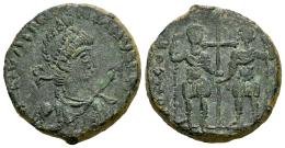 Valentiniano III. Maiorina. 425-455 d.C. Constantinopla para su uso en Cherson. (Ric-X 461). (LRBC-2232). (Tesorillo-Valentiniano III 2, mismo ejemplar). Anv.: D N VALENTINIANVS P F (AVG), Busto con casco, diadema y barbado a la derecha, portando escudo en el brazo izquierdo y lanza apuntando hacia adelante. Rev.: CONCOR(DIA AGV), Theodosio y Valentiniano, nimbado, en pie de frente portando una cruz larga entre ellos; (CONS) en exergo. Ae. 5,03 g. Muy rara. MBC. Est...200,00.