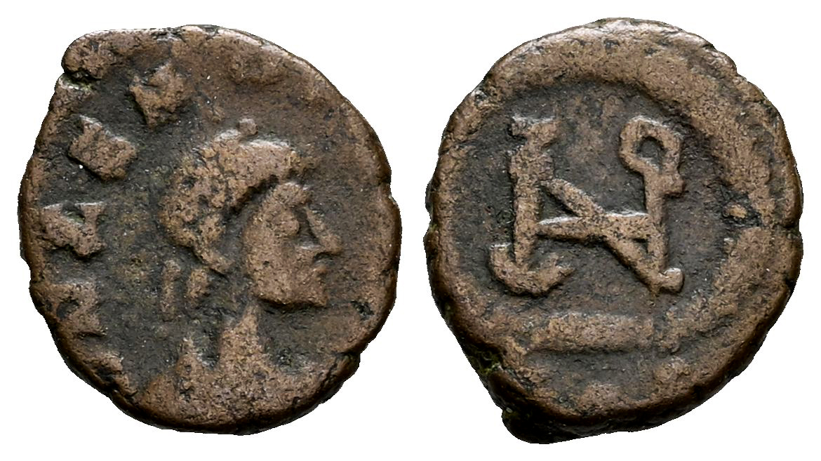 Zeno. Nummus. 476-491 d.C. Nicomedia. (Ric-X 961). (Tesorillo-Zenón 4, mismo ejemplar). Anv.: D N ZENO (P F AVG). Busto de Zeno, con diadema de perlas, drapeado y coraza, a la derecha. Rev.: Monograma Zeno dentro de una corona; en el exergo, NIC. Ae. 0,71 g. Ex J. Vico 118 (Noviembre 2008), lote 346. MBC-. Est...60,00.