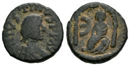 Justino I. Pentanummium. 518-527 d.C. Antioquía. (Doc-57). (MIB-67). (Tesorillo-Justino I 1, mismo ejemplar). Anv.: D N IVSTINVS P P AVG. Busto de Justino I, con diadema, drapeado y coraza, a la derecha. Rev.: Tyche de Antioquía sedente de frente dentro de santuario; a la izquierda, Є. Ae. 1,83 g. Ex David Connors, Vcoins (Diciembre 2006). MBC-/MBC. Est...40,00.