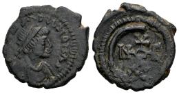 Justiniano I. 5 Nummi. 560-565 d.C. Theoupolis (Antioquía). (Doc-272). (Sear-245). (Tesorillo-Justiniano I 9, mismo ejemplar). Anv.: Leyenda de difícil lectura, busto con diadema de perlas, drapeado y con coraza a la derecha. Rev.: C grande que contiene monograma cruciforme. Ae. 2,11 g. Rayitas. Ex Bizantium Coins, Vcoins (Julio 2009). MBC. Est...60,00.