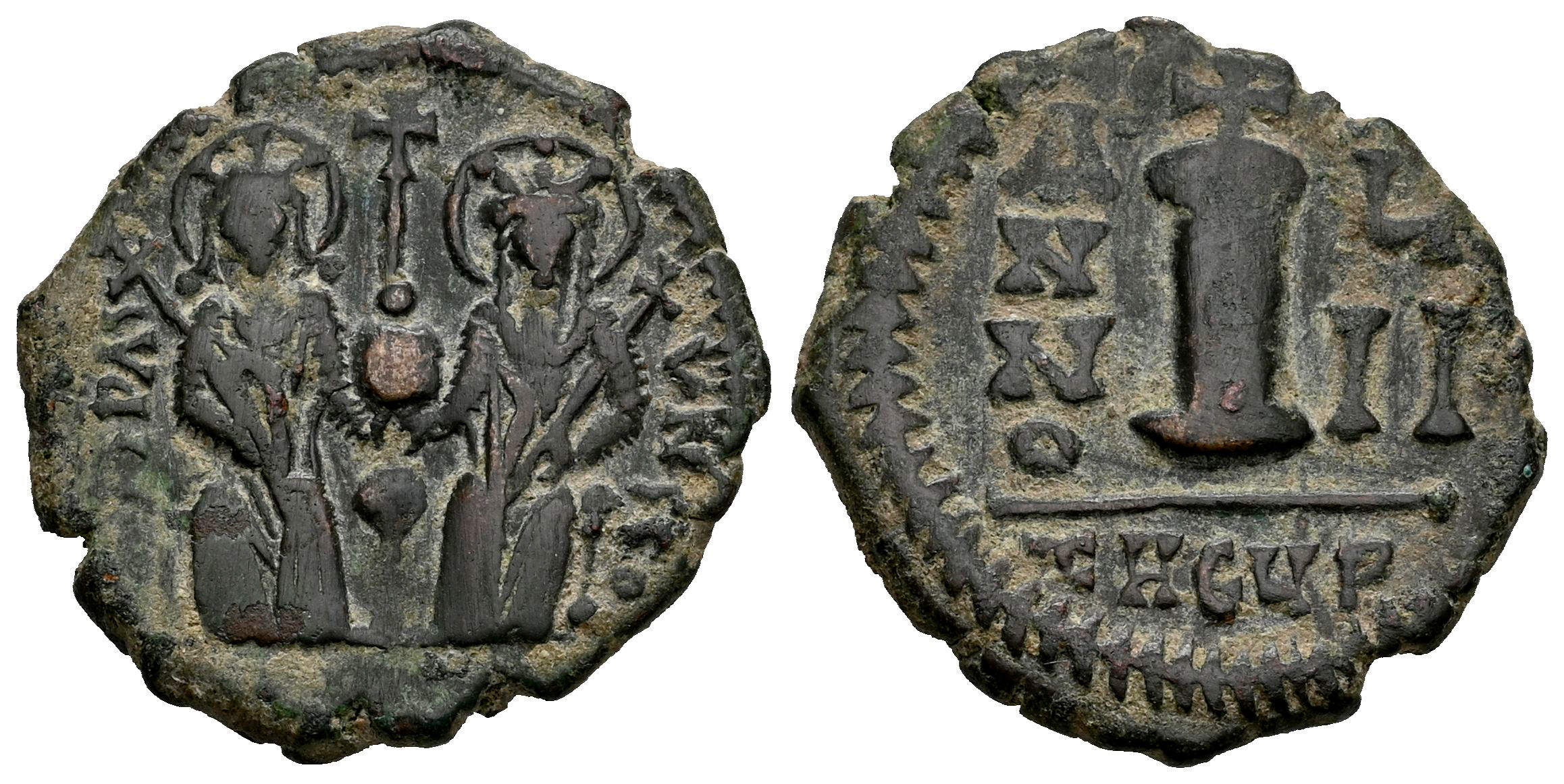 Justino II con Sophia. Decanummium. RY - = 571/2 d.C. Theoupolis (Antioquía). (Doc-177). (MIB-63). (Tesorillo-Justino II 2, mismo ejemplar). Anv.: Justino II, con cetro en la mano derecha, y Sofía, con cetro en la izquierda, sedentes uno frente al otro en un trono doble, sosteniendo un globo cruciforme entre ellos; alrededor, leyenda algo distorsionada. Rev.: Gran I entre A/N/N/O y Ч/II; arriba, cruz; en el exergo, THEЧP. Ae. 3,36 g. Ex Bizantium Coins, Vcoins (Febrero 2008). MBC+. Est...50,00.