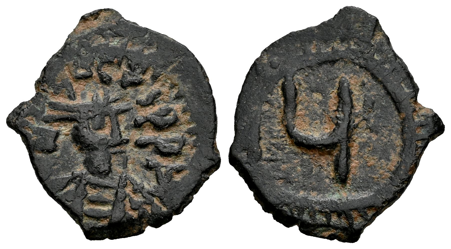 Phocas. Pentanummium. 602-610 d.C. Constantinopla. (Doc-40 var.). (Sear-647 var.). (Tesorillo-Focas 3, mismo ejemplar). Anv.: d m ꟻOCⱯS P P AV. Busto de Focas con diadema, drapeado, barbado y con coraza a la derecha. Rev.: Ч Grande. Ae. 1,25 g. Rara. Ex Inclinatio Roma, Vcoins (Abril 2009). MBC+. Est...60,00.