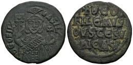 Theophilus. Nummus. 829-842 d.C. Constantinopla. (Doc-15). (Sear-1667). (Tesorillo-Teófilo 1, mismo ejemplar). Anv.: ΘЄOFIL BASIL. Busto de tres cuartos de frente, con loros, corona y toba, sosteniendo labarum y globo crucífero. Rev.: + ΘEO FILЄ AVG OVSTЄ SV NICAS en cuatro líneas. Ae. 6,83 g. Ex Gert Boersema, Vcoins (Septiembre 2010). MBC+/MBC. Est...50,00.