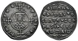 Juan I Zimisces. Miliaresion. 969-976 d.C. Constantinopla. (Doc-7a). (Sear-1792). (Tesorillo-Juan 1, mismo ejemplar). Anv.: + IҺSCHS XRISTCHS ҺICA *. Cruz colocada sobre globo en dos escalones; en el medallón central, busto coronado de frente, flanqueado por I-A, Ѡ-Һ. Rev.: + IѠAҺҺI, ЄҺ X'Ѡ AVTO CRAT, ЄVSЄЬ' ЬASILЄVS RѠMAIѠ' en cinco líneas. Ag. 2,80 g. Suave pátina. Atractiva. Ex Classical Numismatic Group 147 (Septiembre 2006), lote 564. Conserva la etiqueta original. EBC-. Est...200,00.