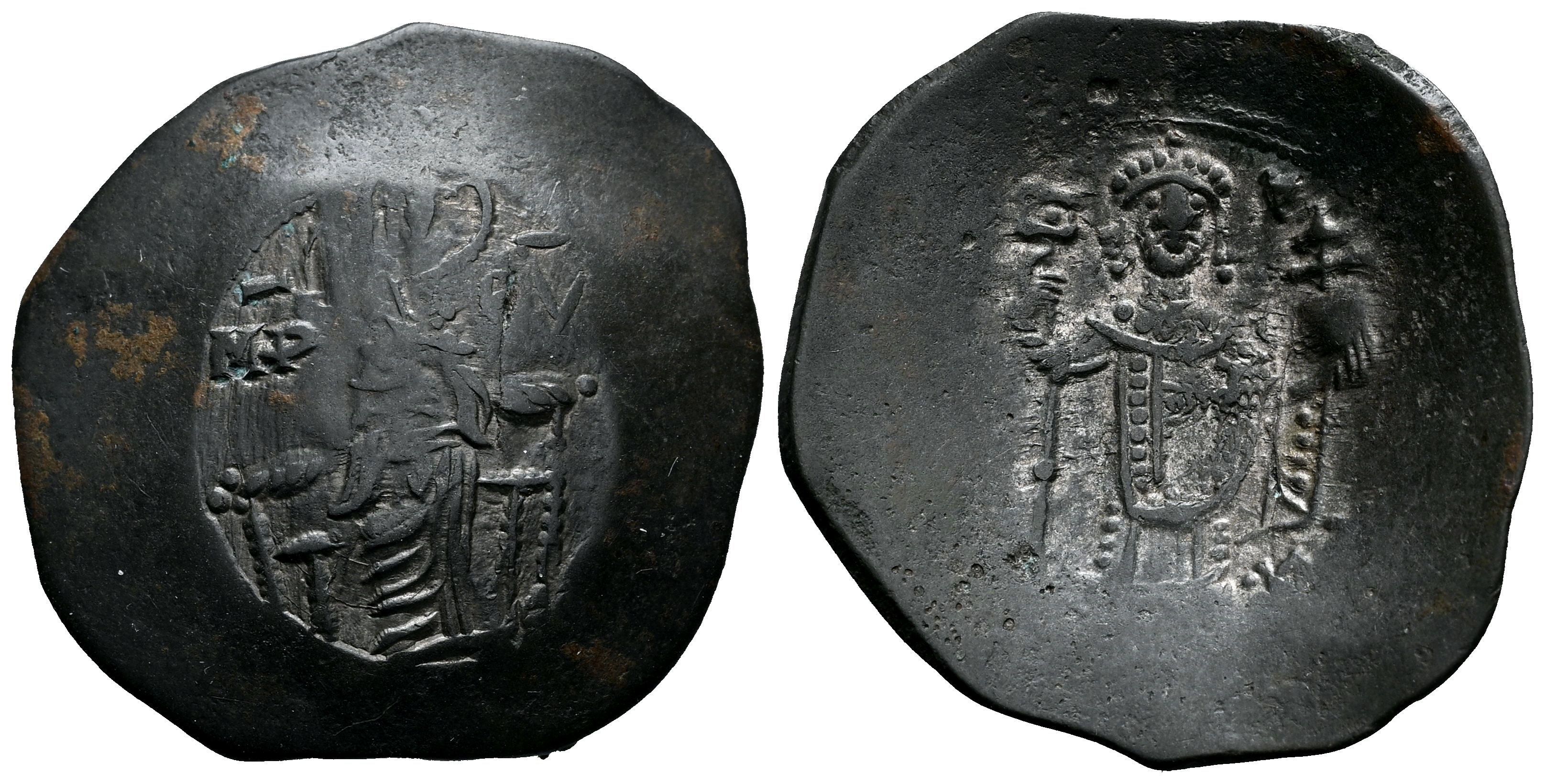 Manuel I Comnenus. Aspron Trachy. 1160-1164 d.C. Constantinopla. (Doc-12a). (Sear-1964). (Tesorillo-Manuel I 1, mismo ejemplar). Anv.: Virgen en trono de frente, sosteniendo al niño Cristo; MHP (ligado)- ΘV a través de los campos. Rev.: (MANOVHΛ) ΔE(CΠOTHC). Emperador en pie de frente, con stemma, divetision y clámide, sosteniendo labarum y la cruz patriarcal sobre globo. Ve. 4,22 g. EX J. Vico 127 (Marzo 2011), lote 382. MBC. Est...40,00.