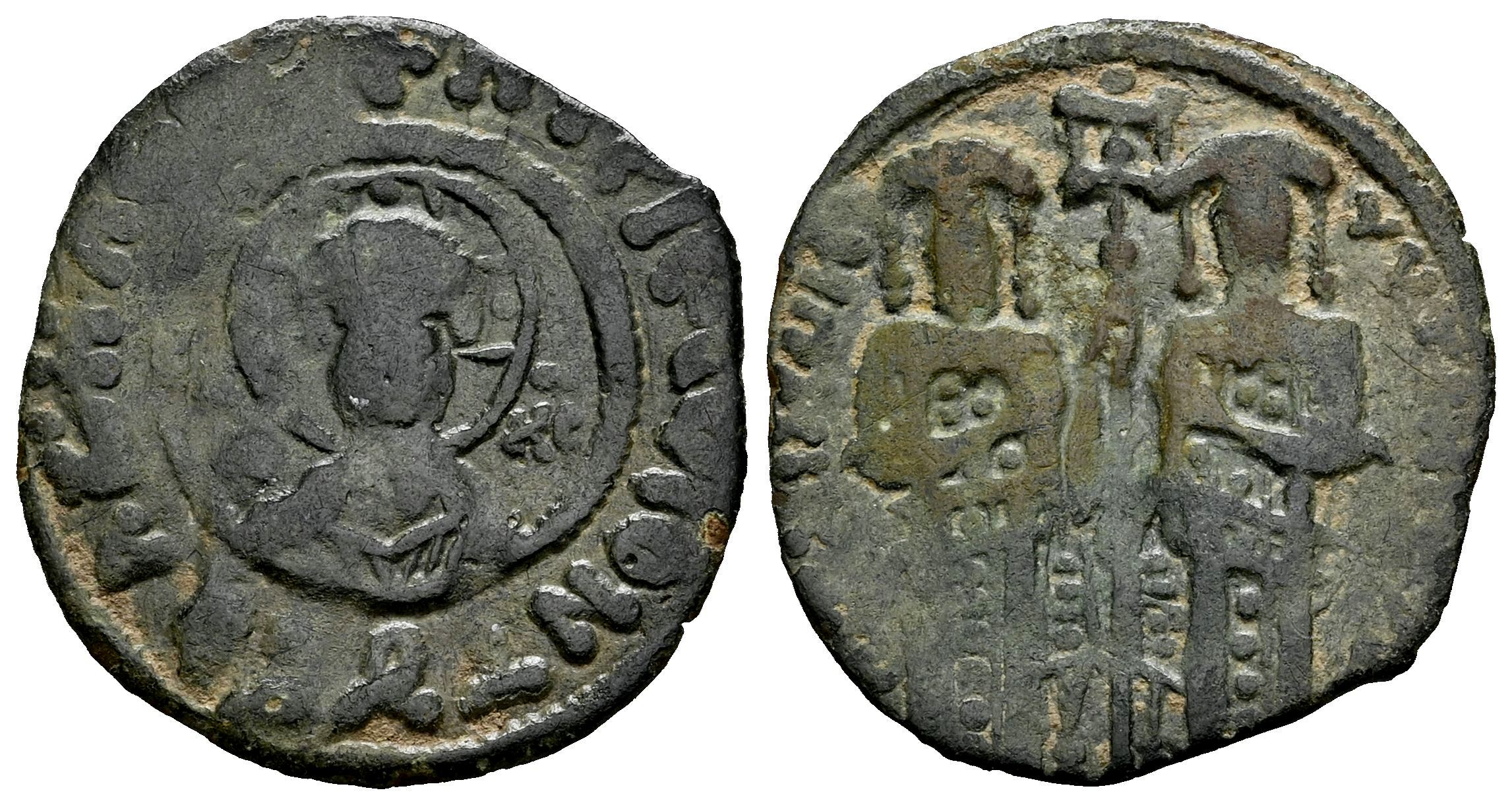 Andronicus II Palaeologus con Michael IX. Assarion. 1295-1320 d.C. Constantinopla. (Doc-681/2). (Sear-2436). (Tesorillo-Andrónico II 3, mismo ejemplar). Anv.: + KVPIЄ CωCON TOVC BACIΛЄIC. Busto de Cristo drapeado y de frente; IC - XC a través de los campos. Rev.: AVTOKPATOPЄC POMAION. Andrónico II y Miguel IX en pie, uno frente al otro, sosteniendo el labarum entre ellos. Ae. 1,53 g. Escasa. Ex Gert Boersema, Vcoins (Septiembre 2009). Conserva la etiqueta original. MBC. Est...90,00.