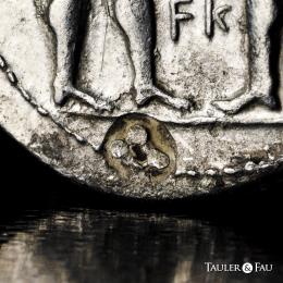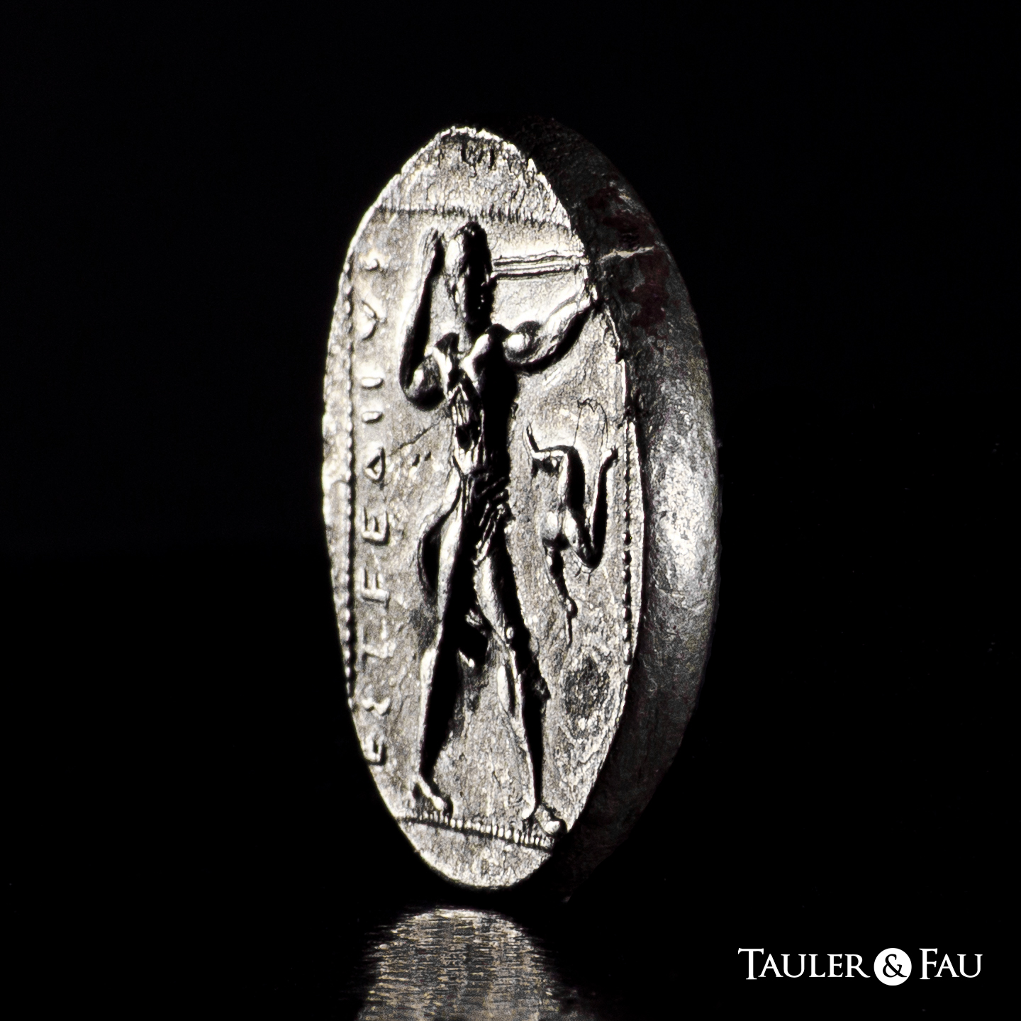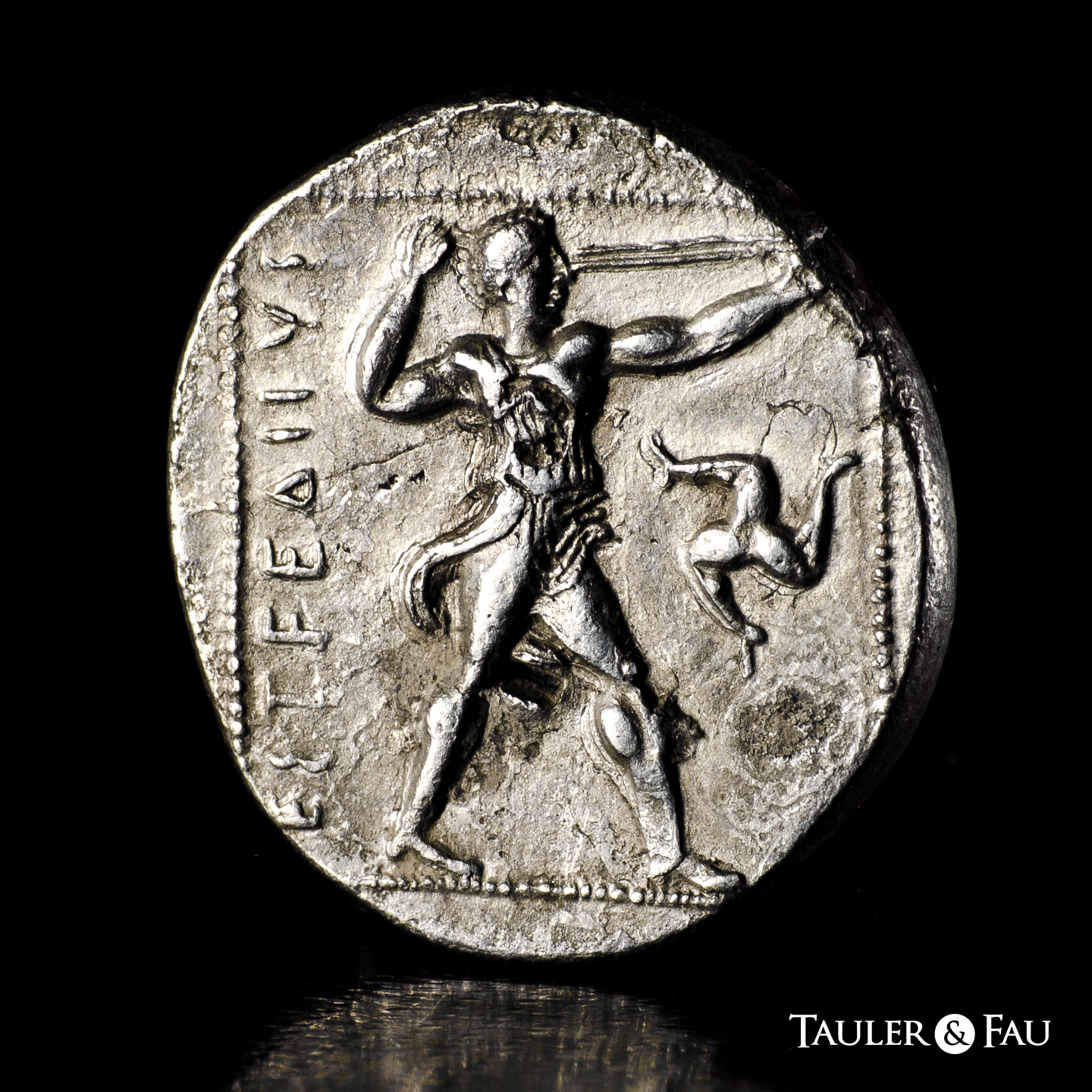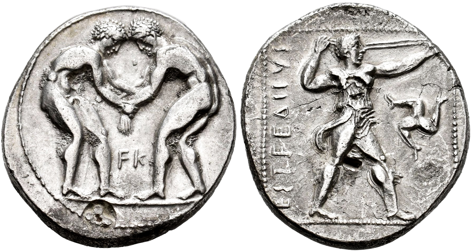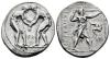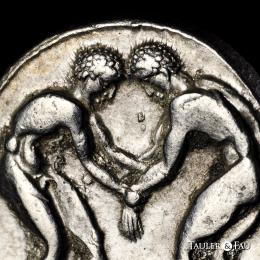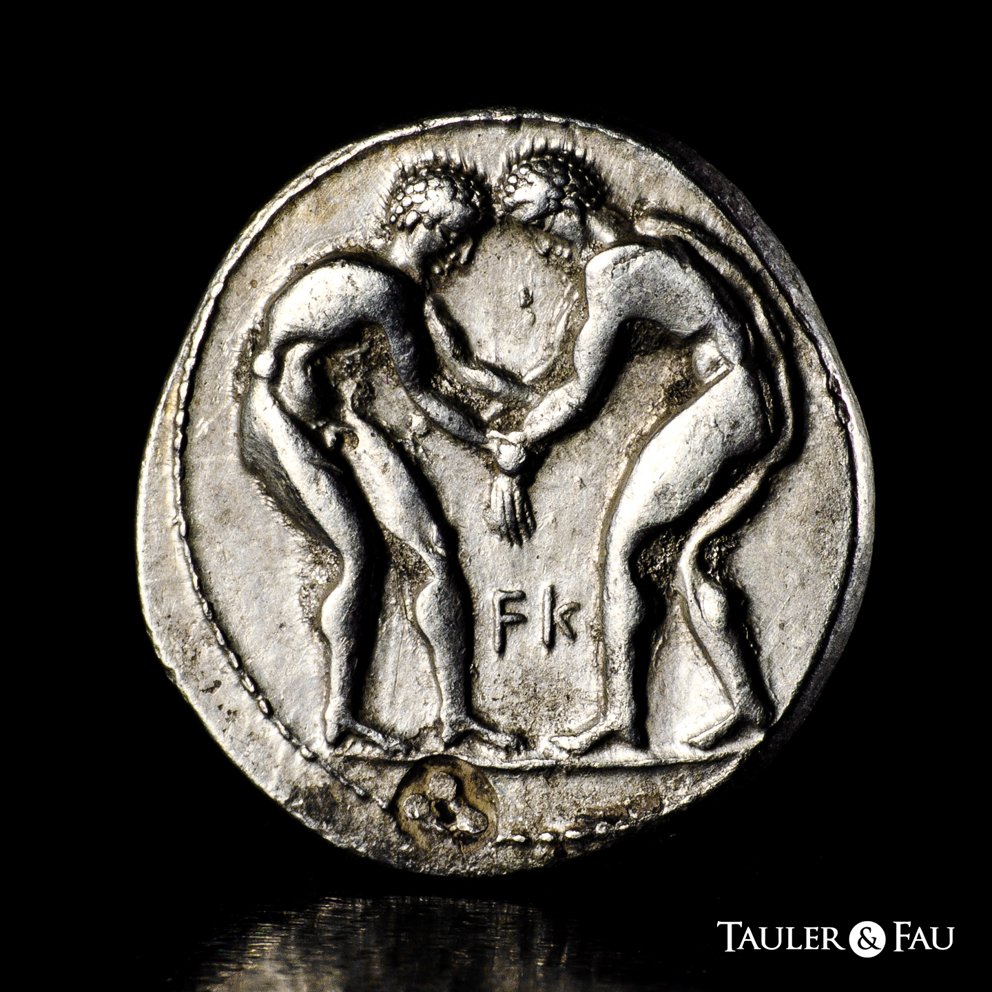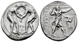 Pamphylia. Aspendos. Estátera. 380-325 a.C. (Tekin-Series 4). (Arslan & Lightfoot-121). (Tesorillo-Panfilia 1, mismo ejemplar). Anv.: Dos luchadores desnudos, en pie y luchando entre sí; entre ellos, FK. Rev.: ΕΣΤFΕΔΙΙΥΣ. Hondero en pie a la derecha; hacia la derecha, triskeles corriendo a la derecha; a la derecha. Ag. 10,69 g. Contramarca "X o astragalos" dentro de círculo en anverso y punzones de prueba en el reverso. EBC-/MBC+. Est...300,00.