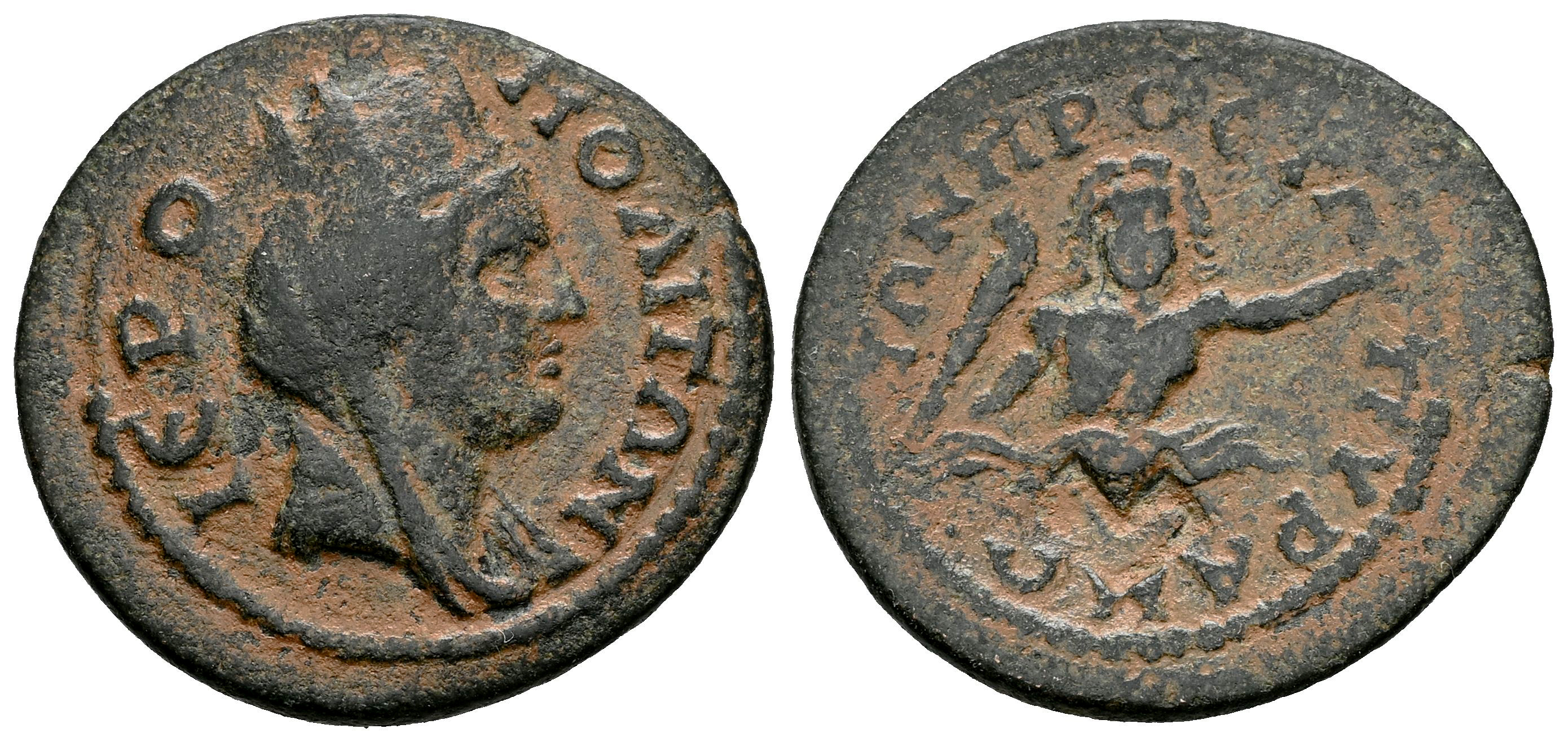 Cilicia. Ierapolis-Kastabala. Assarion. Siglo I-II d.C. (RPC-II online 1784). (Sng Levante-1570). (Tesorillo-Cilicia 3, mismo ejemplar). Anv.: IЄPOΠOΛITΩN. Busto velado, con corona mural y drapeado de la diosa de la ciudad a la derecha. Rev.: TΩN ΠPOC TΩ ΠYPAMΩ. El dios del río Pyramos nadando hacia la derecha, extendiendo su brazo izquierdo y sosteniendo una antorcha en el derecho. Ae. 5,55 g. Contramarca "L" dentro de cartela ajustada a su forma en el reverso. MBC/MBC+. Est...90,00.