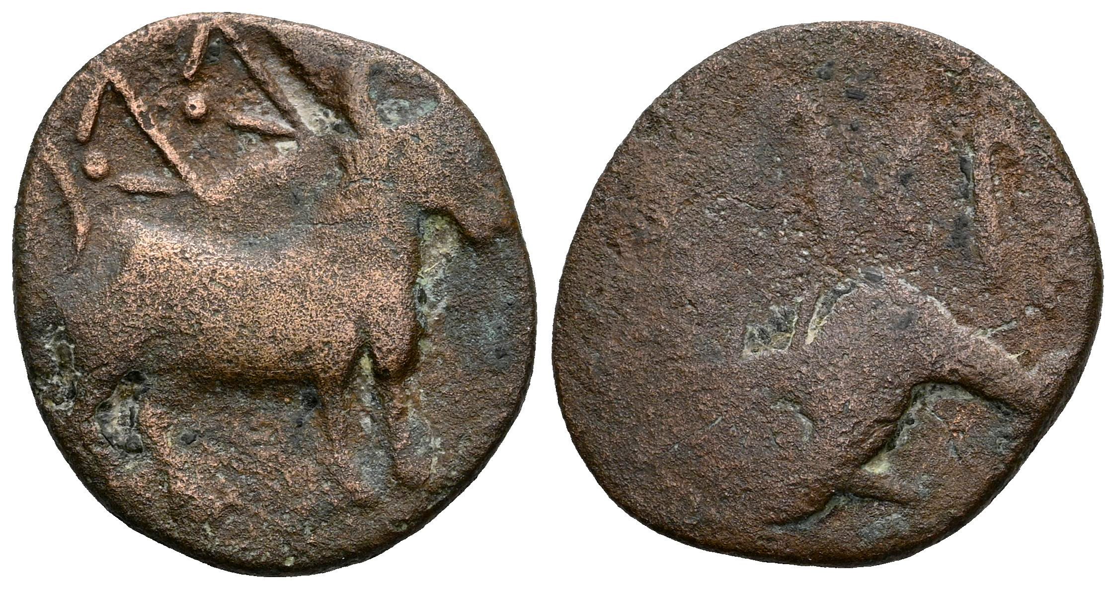 Asido. Semis. 50 a.C. Medina Sidonia (Cádiz). (Abh-158). (MIB-436/102). (Tesorillo-4-10/1, mismo ejemplar). Anv.: Toro a derecha, encima estrella. Rev.: Delfín a derecha, creciente y punto, caduceo y leyenda libio fenicia. Ae. 3,97 g. Contramarca "B´B´L" en feno-púnico e interpretado como "de los ciudadanos" aplicada para su legalización y efectuada sobre el anverso. Escasa. BC+/BC. Est...90,00.
