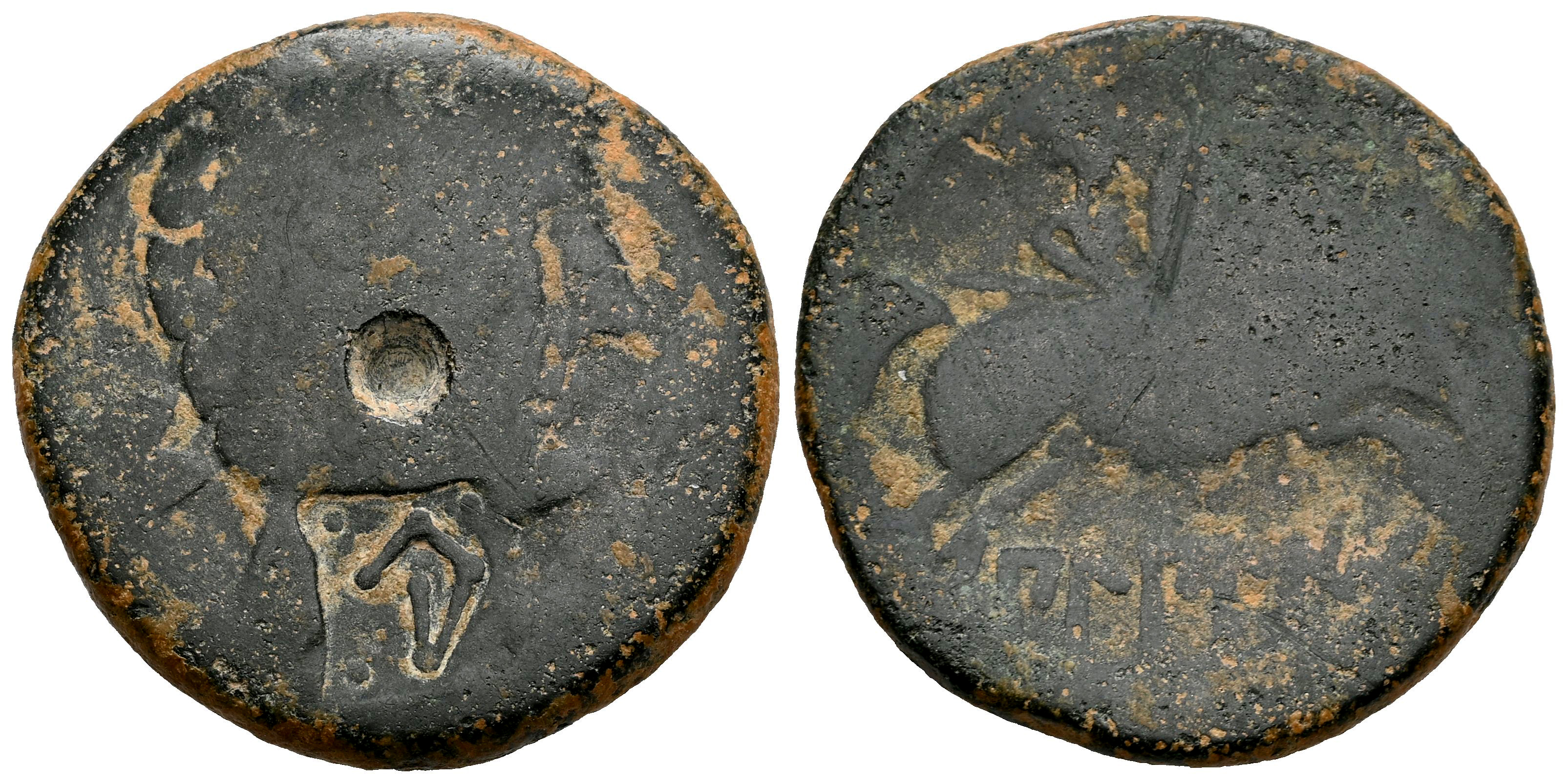 Bilbilis. As. 120-30 a.C. Calatayud (Zaragoza). (Abh-254). (MIB-475/114 ID 115806, mismo ejemplar). (Tesorillo-2-67 y 6-30, mismo ejemplar). Anv.: Cabeza masculina a derecha, delante delfín, detrás letra ibérica S. Rev.: Jinete con lanza a derecha, debajo leyenda ibérica BILBILIS. Ae. 13,51 g. Contramarca "monograma ibérico" rodeada de 4 puntos dentro de cartela cuadrada y marca de punzón circular, ambas en anverso. Muy rara. BC. Est...120,00.
