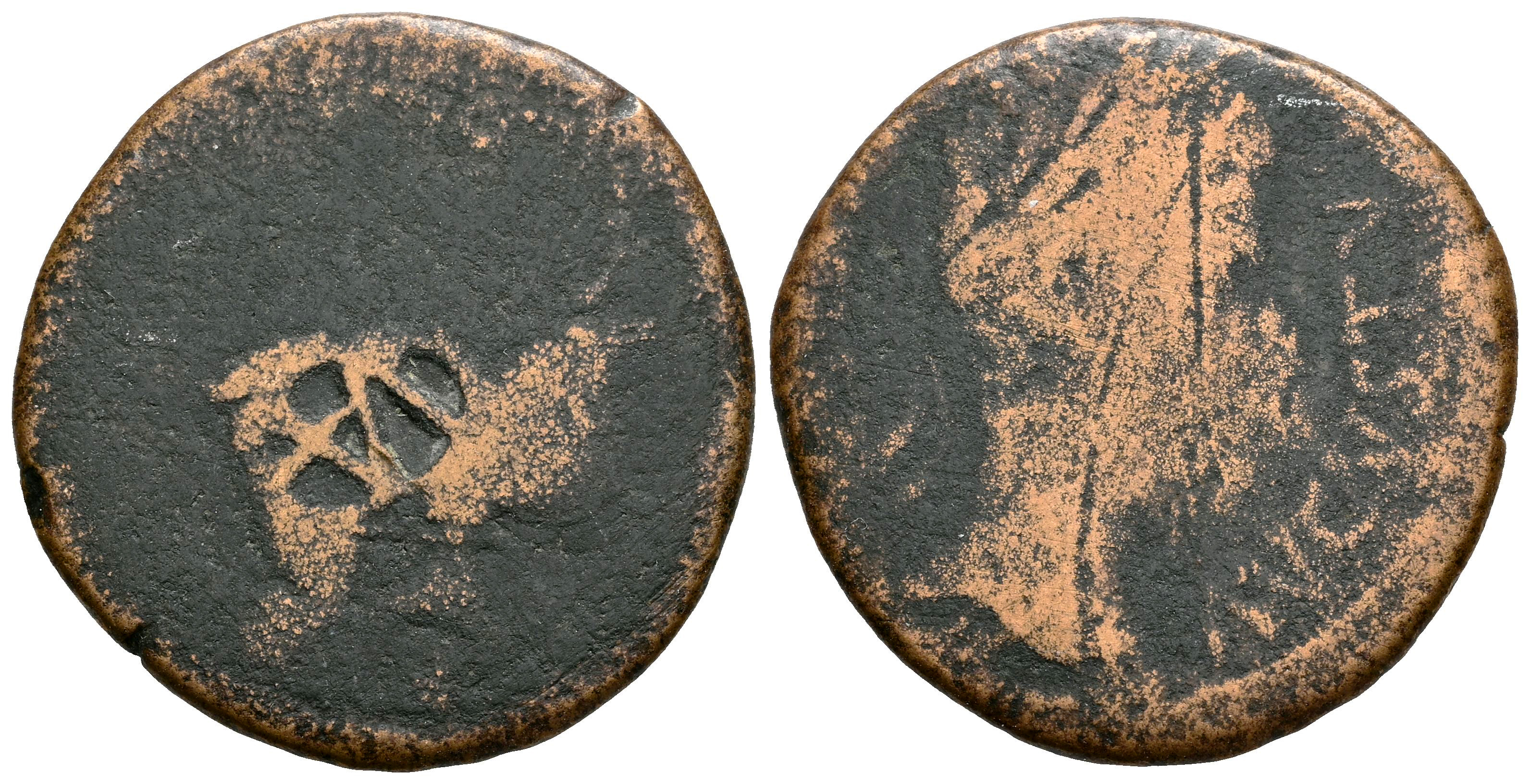 Bilbilis. Época de Augusto. As. 27 a.C-14 d.C. Calatayud (Zaragoza). (Abh-275). (MIB-224/99). (Tesorillo-5-37/3, mismo ejemplar). Anv.: Cabeza laureada de Augusto a derecha, leyenda AVGVSTVS. DIV. F. Rev.: Jinete con lanza a derecha debajo BILBILIS. Ae. 9,35 g. Contramarca "VAL" interpretada como VALEAT dentro de un óvalo en el anverso. Adquirida a Lluis Lalana S.C.P., conserva la etiqueta original. BC-. Est...50,00.
