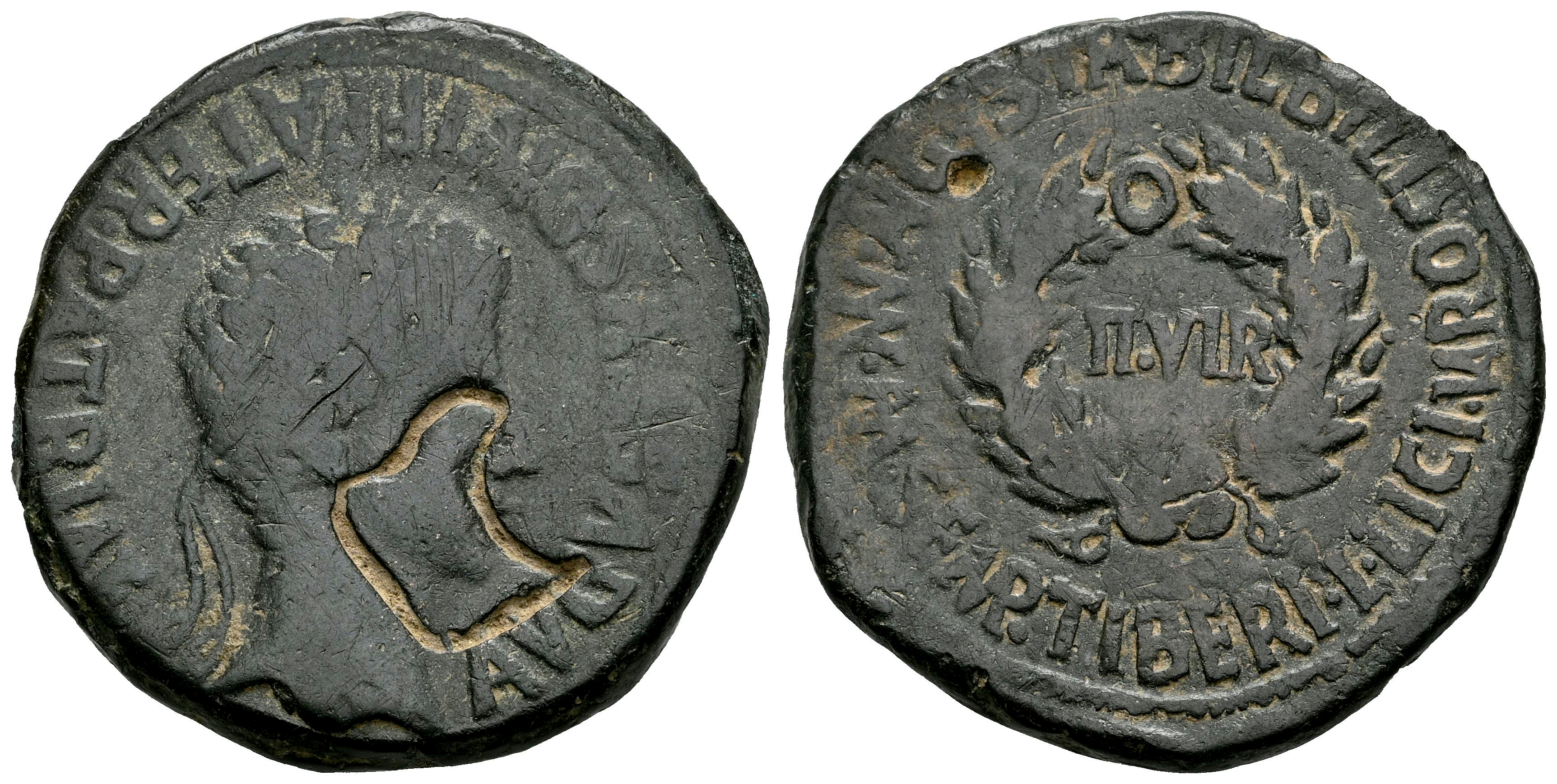 Bilbilis. Época de Augusto. As. 27 a.C-14 d.C. Calatayud (Zaragoza). (Abh-278). (Tesorillo-1-13a/4, mismo ejemplar). Anv.: Cabeza laureada de Augusto a derecha, alrededor leyenda AVGVSTVS. DIV. F. PATER. PATRIAE. Rev.: Láurea, dentro II.VIR, alrededor leyenda MVN. AVGVSTA. BILBILIS. M. SEMP. TIBERI. L. LICI. VARO. Ae. 14,24 g. Contramarca "Cabeza de águila legionaria" a la derecha en anverso. MBC/MBC+. Est...120,00.