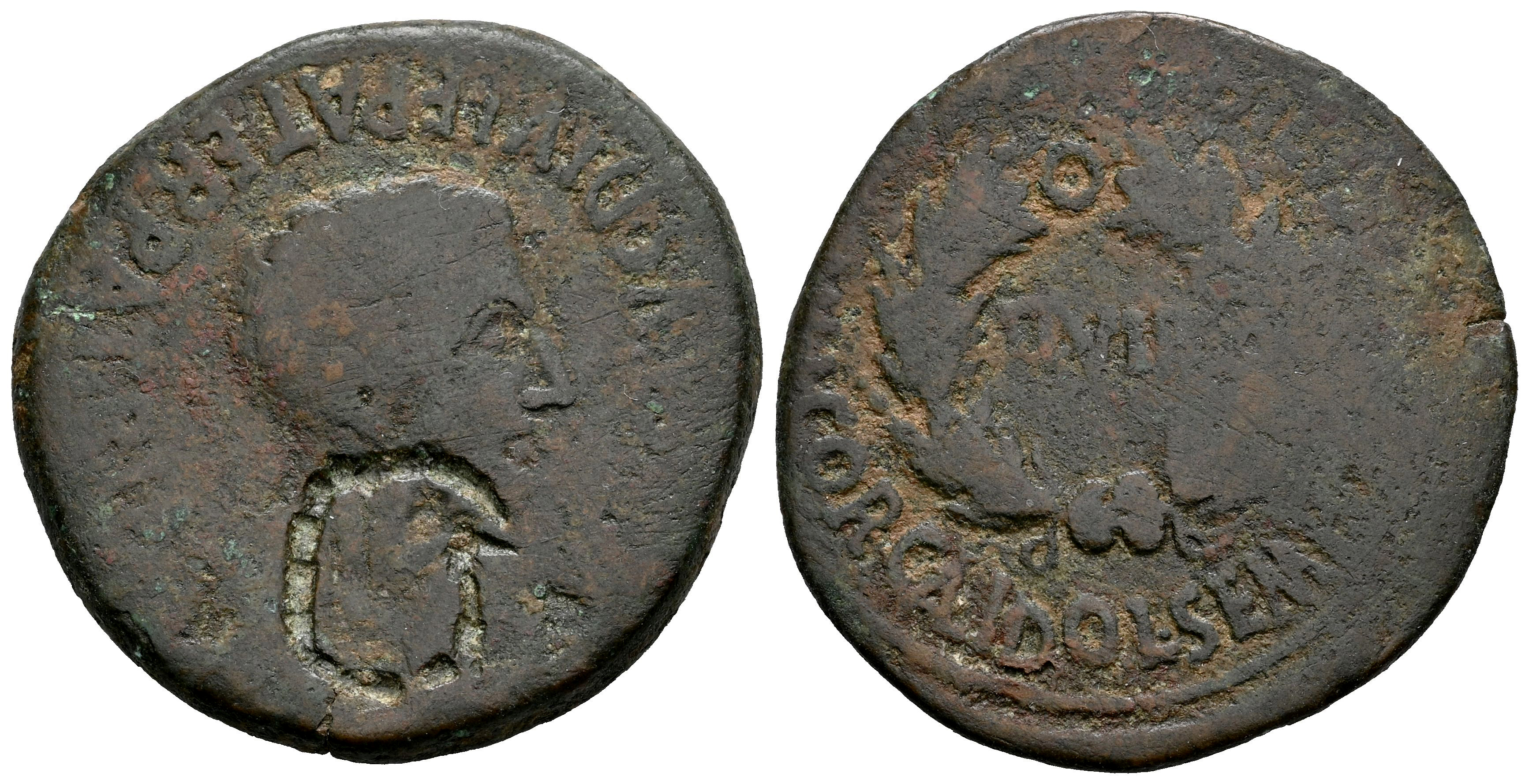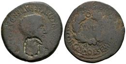 Bilbilis. Época de Augusto. As. 27 a.C-14 d.C. Calatayud (Zaragoza). (Abh-280). (Tesorillo-6-02/1, mismo ejemplar). Anv.: Cabeza laureada de Augusto a derecha, alrededor leyenda AVGVSTVS. DIV. F. PATER. PATRIAE. Rev.: Láurea, dentro II.VIR, alrededor MVN. AVGVSTA. BILBILIS. L. COR. CLDO. L. SEMP. RVTLO. Ae. 12,79 g. Contramarca "cabeza de águila legionaria" a la derecha con un arte especialmente tosca en el anverso. Escasa. BC+. Est...60,00.