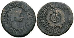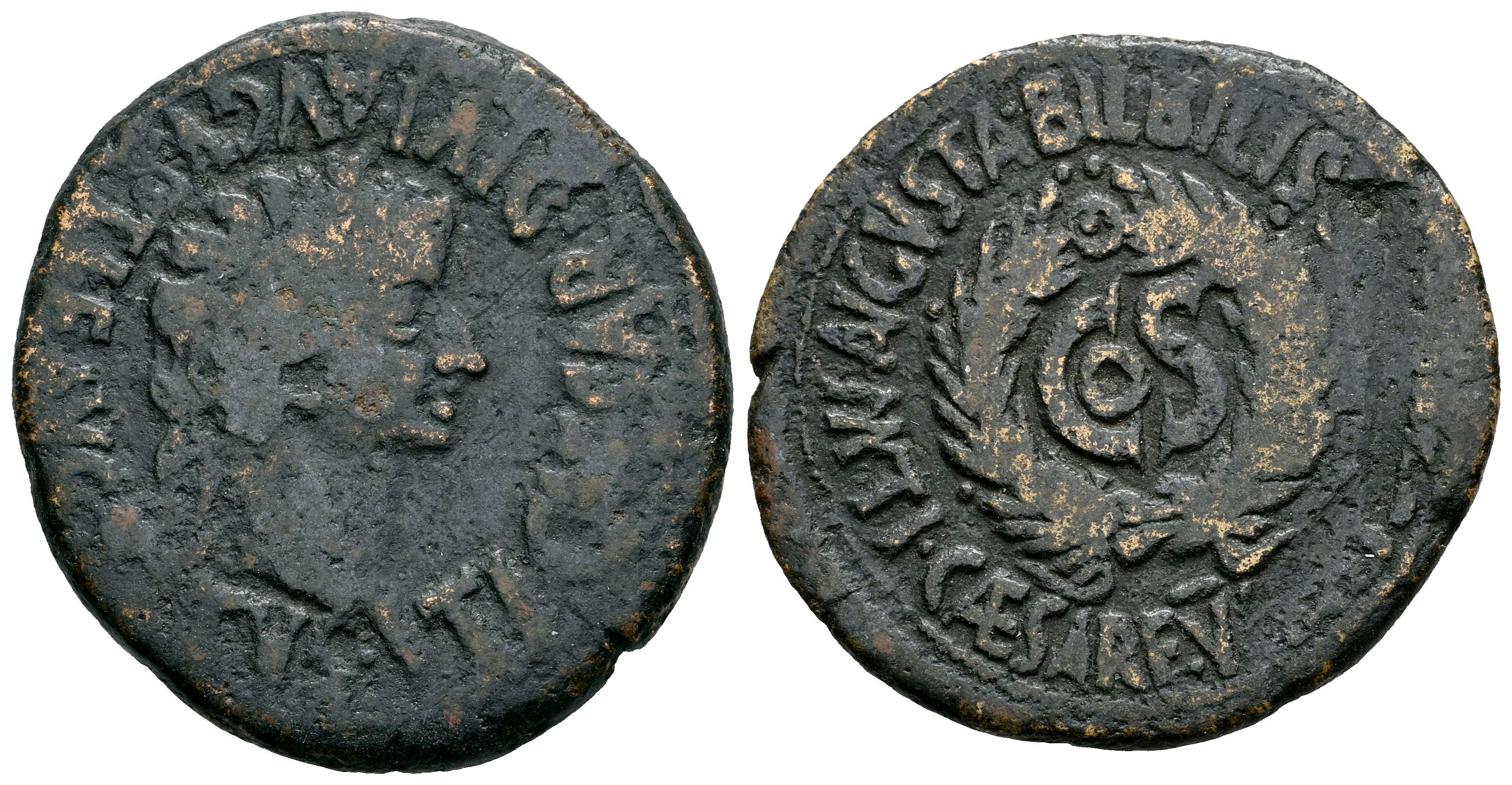Bilbilis. Época de Tiberio. As. 14-36 d.C. Calatayud (Zaragoza). (Abh-284). (Tesorillo-6-31/2, mismo ejemplar). Anv.: Cabeza laureada de Tiberio a derecha, alrededor TI. CAESAR. DIVI. AVGVSTI. F. AVGVSTVS. Rev.: Láurea, dentro COS, alrededor MVN. AVGVSTA. BILBILIS. TI. CAESARE. V. (L. AELIO. SEIANO). Ae. 9,55 g. Contramarca elimilando parte de la leyenda del reverso "L. AELIO. SEIANO", único caso en Hispania en el que se aplicó el "DAMNATIO MEMORIAE". Muy rara. Ex Cayón 53 (27/11/2018), lote 88. Conserva la etiqueta original. BC+/MBC-. Est...120,00.