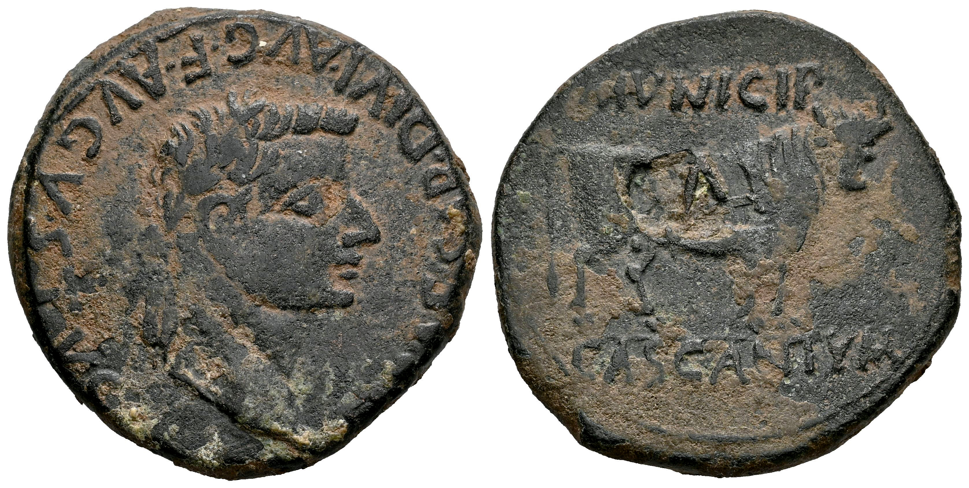 Kaiskata. Época de Tiberio. As. 14-36 d.C. Cascante (Navarra). (Abh-691). (Tesorillo-4-17/2, mismo ejemplar). Anv.: Cabeza laureada de Tiberio a derecha, alrededor TI. CAESAR. DIVI. AVG. F. AVGVSTVS. Rev.: Toro a derecha, encima MVNICIP, debajo CASCANTVM. Ae. 14,58 g. Contramarca "CAS" de CAScantvm dentro de cartela rectangular en reverso. MBC+/MBC. Est...120,00.