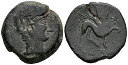Kastilo-Castulo. As. 180 a.C. Cazlona (Jaén). (Abh-701). (MIB-ID 172164, mismo ejemplar). (Tesorillo-5-32 Castulo, mismo ejemplar). Anv.: Cabeza masculina diademada a derecha, delante mano. Rev.: Esfinge a derecha con estrella, leyenda KASTILO a derecha, debajo de línea. Ae. 12,27 g. Contramarca "S.AE" anexadas dentro de cartela rectangular en anverso. Rara. MBC/MBC-. Est...80,00.