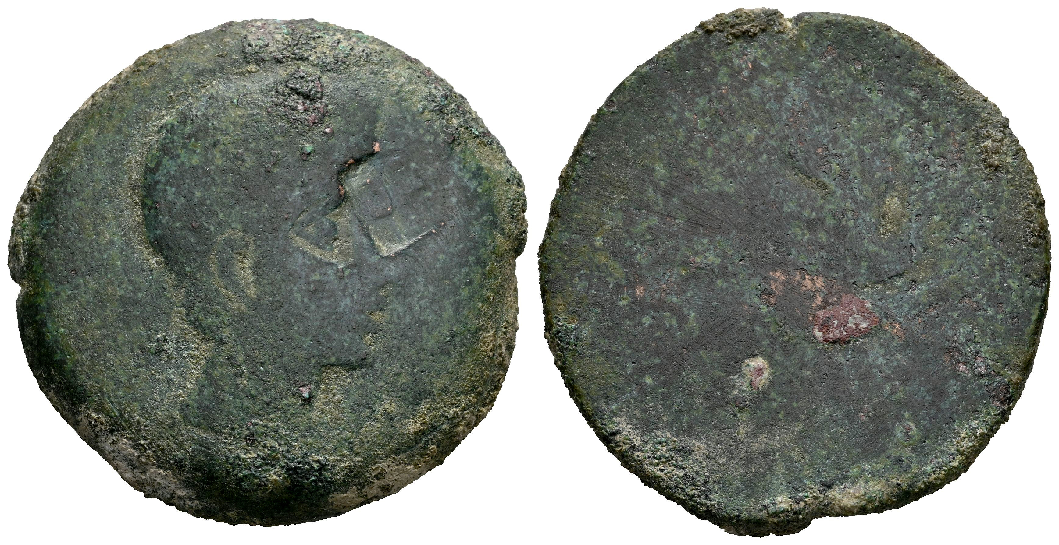 Kastilo-Castulo. As. 180 a.C. Cazlona (Jaén). (Abh-706). (Tesorillo-4-35, mismo ejemplar). Anv.: Cabeza masculina con diadema a derecha. Rev.: Esfinge a derecha. Ae. 17,68 g. Contramarca "ЄP" dentro de cartela rectangular en anverso. Muy rara. BC/BC-. Est...50,00.