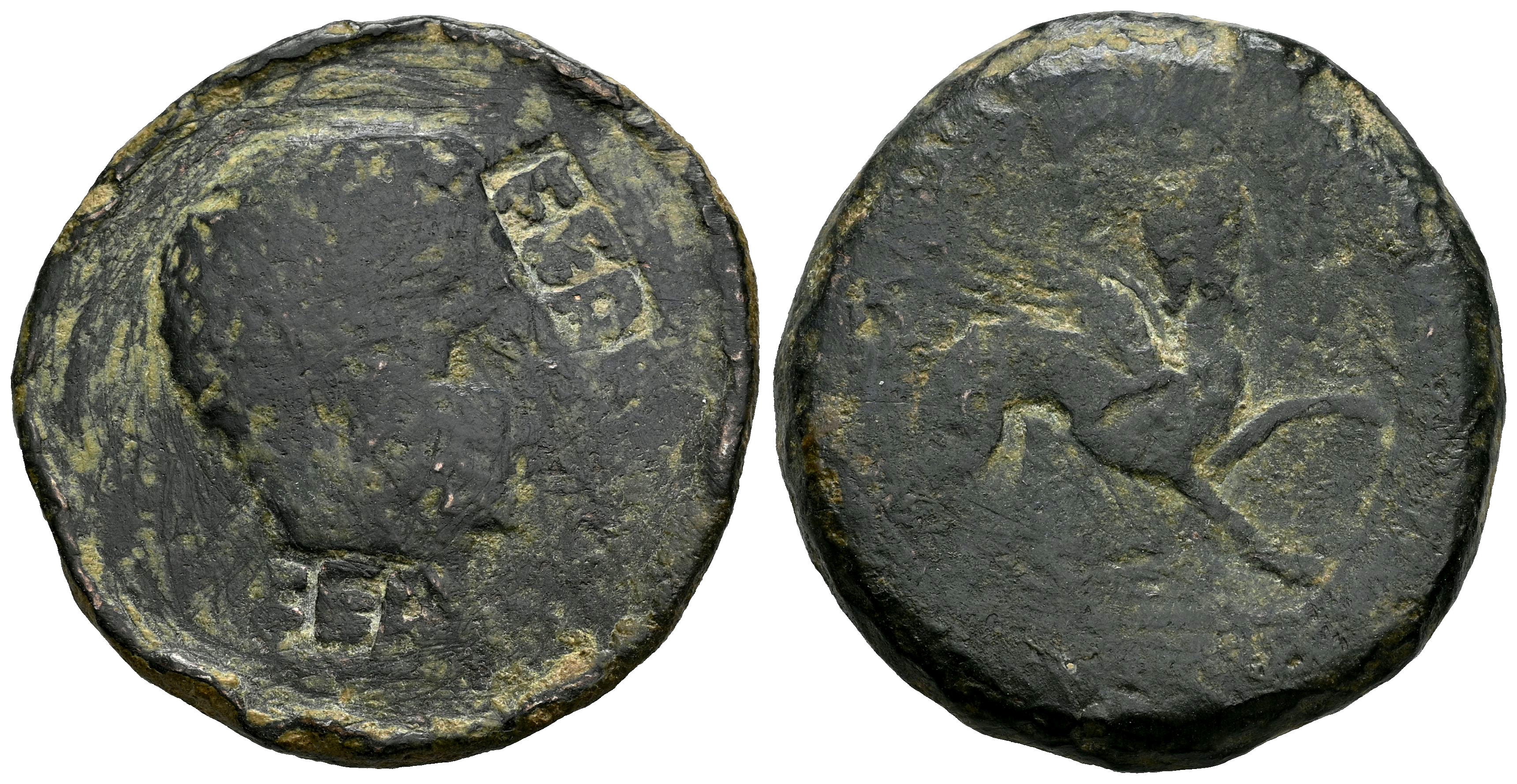 Kastilo-Castulo. As. 180 a.C. Cazlona (Jaén). (Abh-707). (MIB-419/68 ID 107805, mismo ejemplar). (Tesorillo-4-36/3, mismo ejemplar). Anv.: Cabeza masculina laureada a derecha. Rev.: Esfinge a derecha, delante estrella, debajo leyenda KASTILO. Ae. 16,86 g. Dos contramarcas de "FER" interpretada como FERraria (Herrería) dentro de cartela rectangular en anverso. Ex Roma Numismatics 52 (10/01/2019), lote 10. Conserva la etiqueta original. BC. Est...80,00.