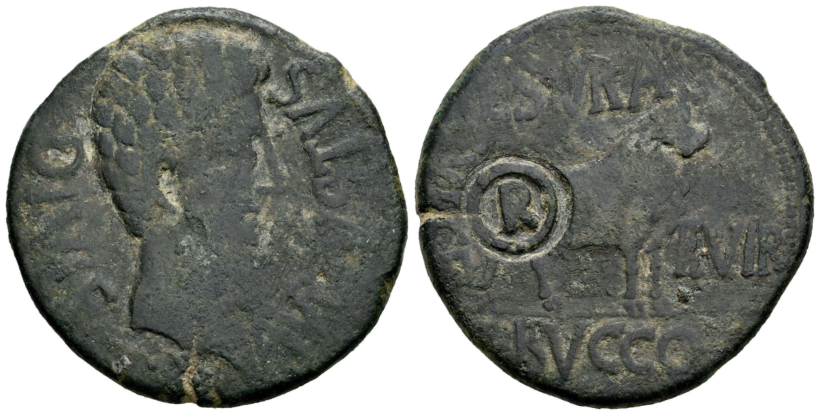 Kelse-Celsa. Época de Augusto. As. 27 a.C-14 d.C. Velilla de Ebro (Zaragoza). (Abh-808). (MIB-90/53). (Tesorillo-3-40/7, mismo ejemplar). Anv.: Cabeza de Augusto a derecha, alrededor. AVGVSTVS. DIVI. F. Rev.: Toro parado a derecha, encima L. SVRA, debajo L. BVCCO, a los lados II. VIR. C. V. I. CEL. Ae. 12,19 g. Contramarca "R" dentro de círculo en el reverso. MBC-. Est...60,00.