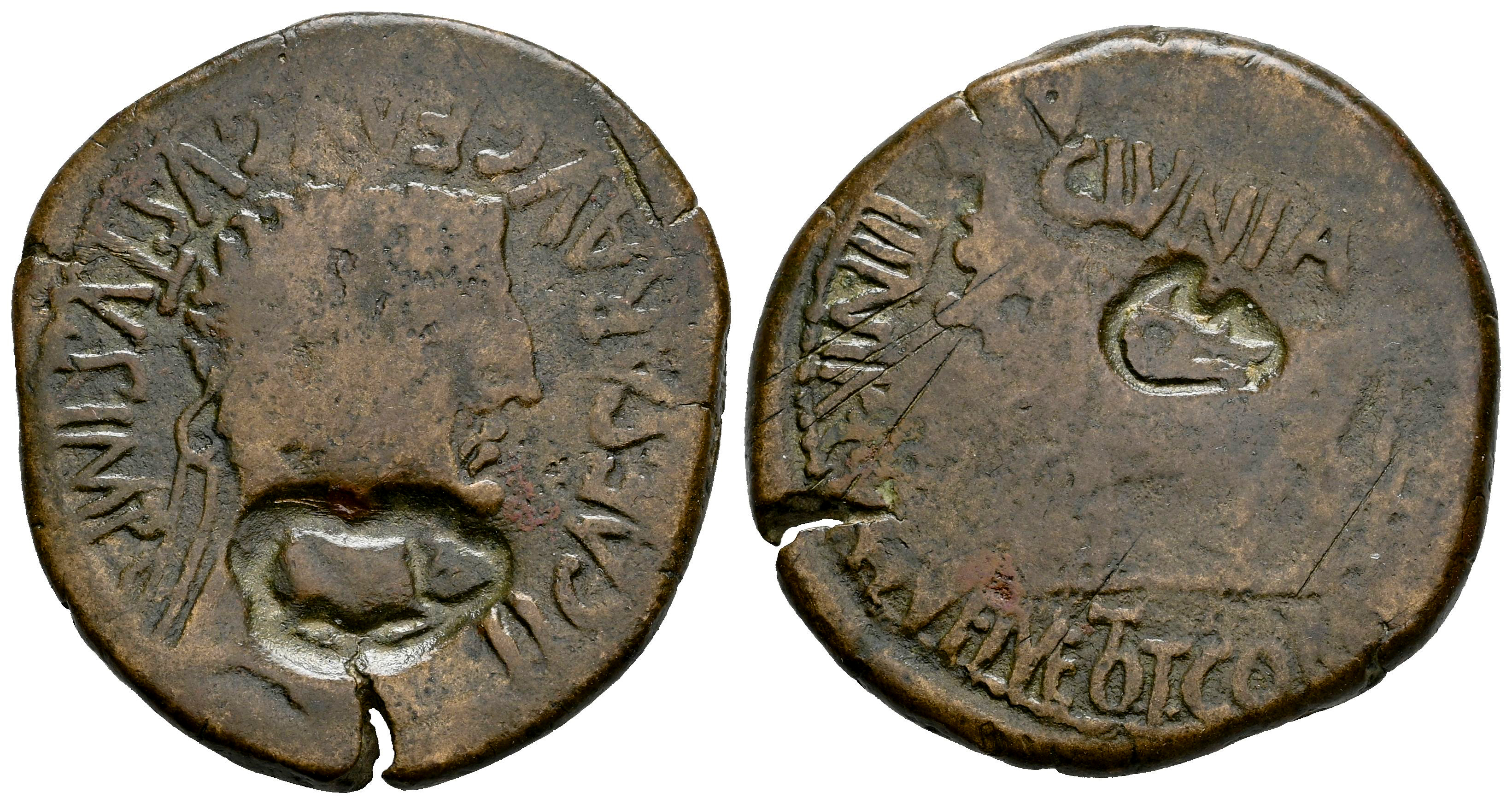 Clunia. Época de Tiberio. As. 37-41 d.C. Coruña del Conde (Burgos). (Abh-838). (Tesorillo-1/01/02a, mismo ejemplar). Anv.: Cabeza laureada de Tiberio a derecha, alrededor TI. CAESAR. AVG. E AVGVSTVS. IMP. Rev.: Toro a izquierda, alrededor C. AEM. METO. T. COR. MATE. L. CAEL. PRES. C. CAEL. CA. IIII. VIR. Ae. 12,33 g. Contramarcas de Jabalí acostado en anverso y cabeza de jabalí en reverso. Muy bien marcados y nítidos. Atractiva pátina verde. Ex J. Vico 119 (02/04/2009), lote 447. Conserva la etiqueta original. MBC-/BC+. Est...60,00.